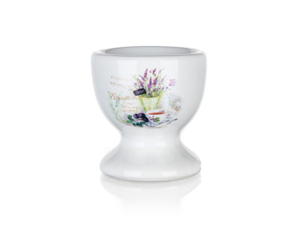 Kalíšek na vajíčko LAVENDER v bílé glazuře s dekorem levandule je vyrobený z keramiky.
