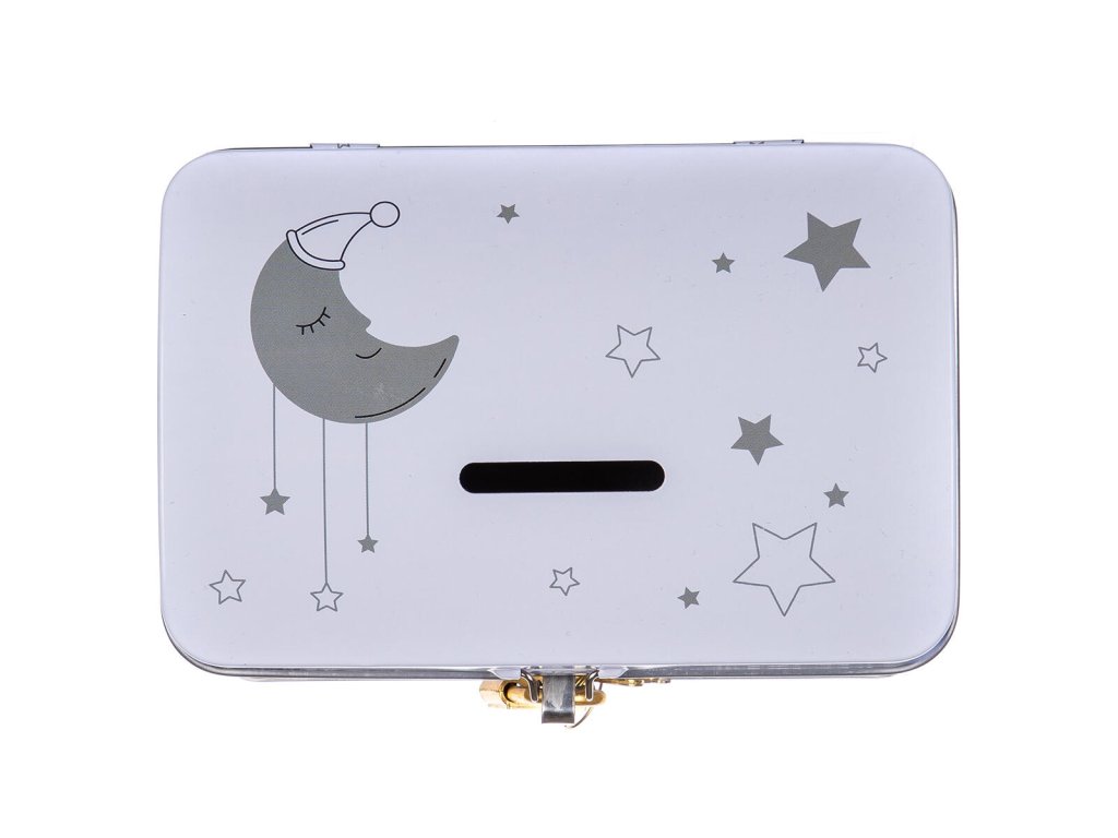 Plechovka - kasička truhla 4KIDS v bílé barvě s dekorem hvězdiček, vhodné pro šetření peněz.