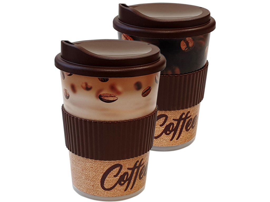 Plastový kelímek s víčkem a pítkem, vhodný na servírování kávy.