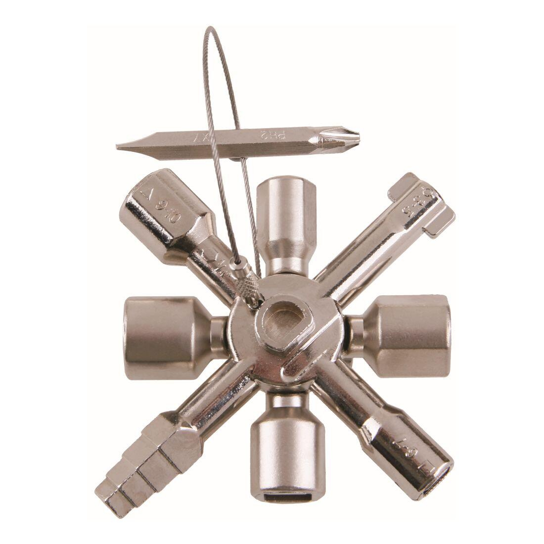 Univerzální klíč pro otevírání elektrických rozvaděčů, plynových a vodních kohoutů, pro klimatizaci, ventilaci a odvzdušňování topení.