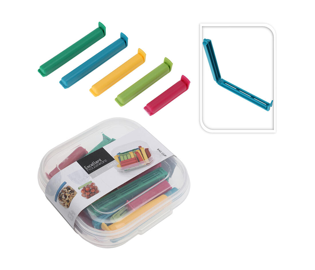 Sada barevných plastových klipů na uzavírání sáčků v domácnosti.