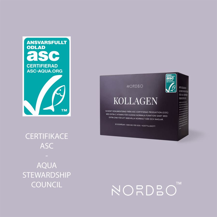 Nordbo Kollagen obsahuje hydrolyzovaný rybí kolagen Ecolovita® s kolagenovými peptidy typu I., přidaný vitamín C ve formě kyseliny L-askorbové a zinek ve formě L-askorbátu zinečnatého. Účinek obsaženého kolagenu Ecolovita® je zdokumentován klinickou studií, přidaný vitamín C a zinek zlepšují využitelnost kolagenu v těle - obě tyto látky jsou v organismu zapojené do jeho přirozené produkce. Nordbo Kollagen má jako jediný doplněk svého druhu na světě prestižní certifikaci ASC, která garantuje udržitelnost produkce a zároveň čerstvost rybí suroviny.