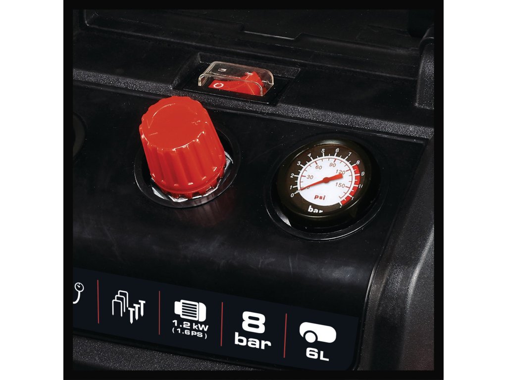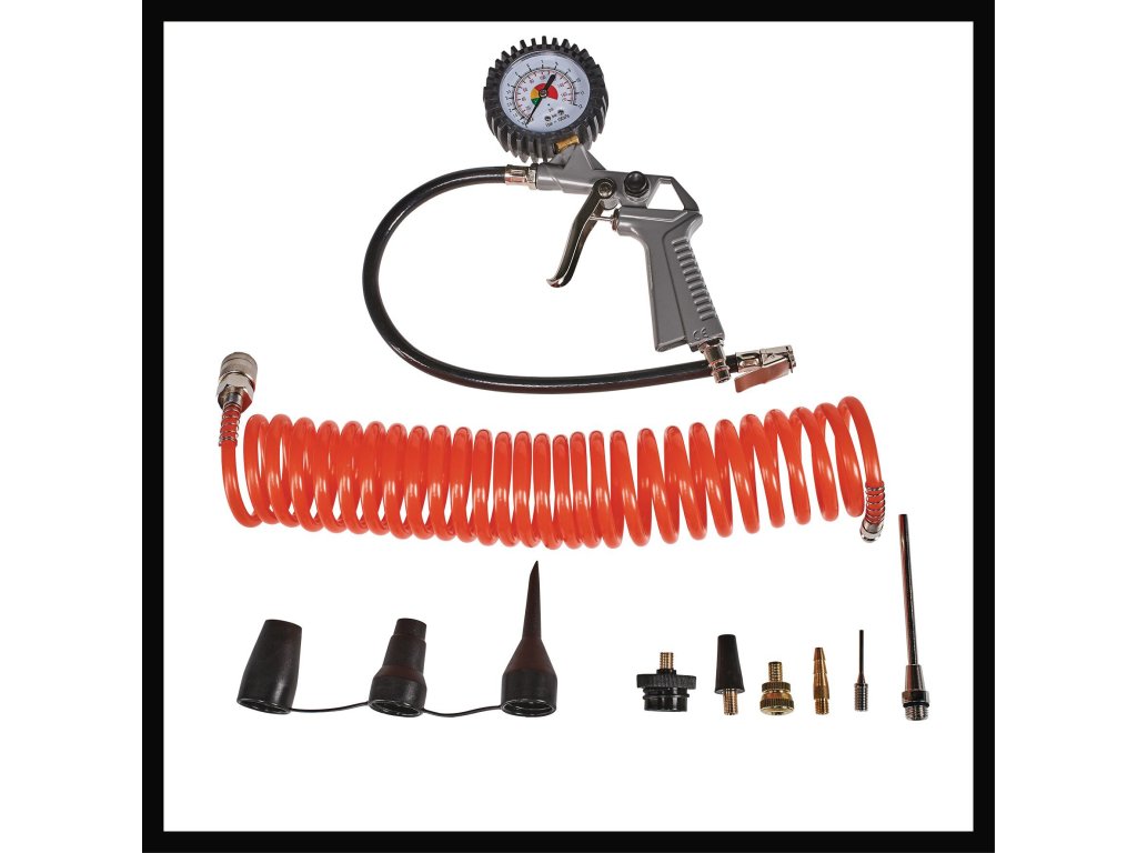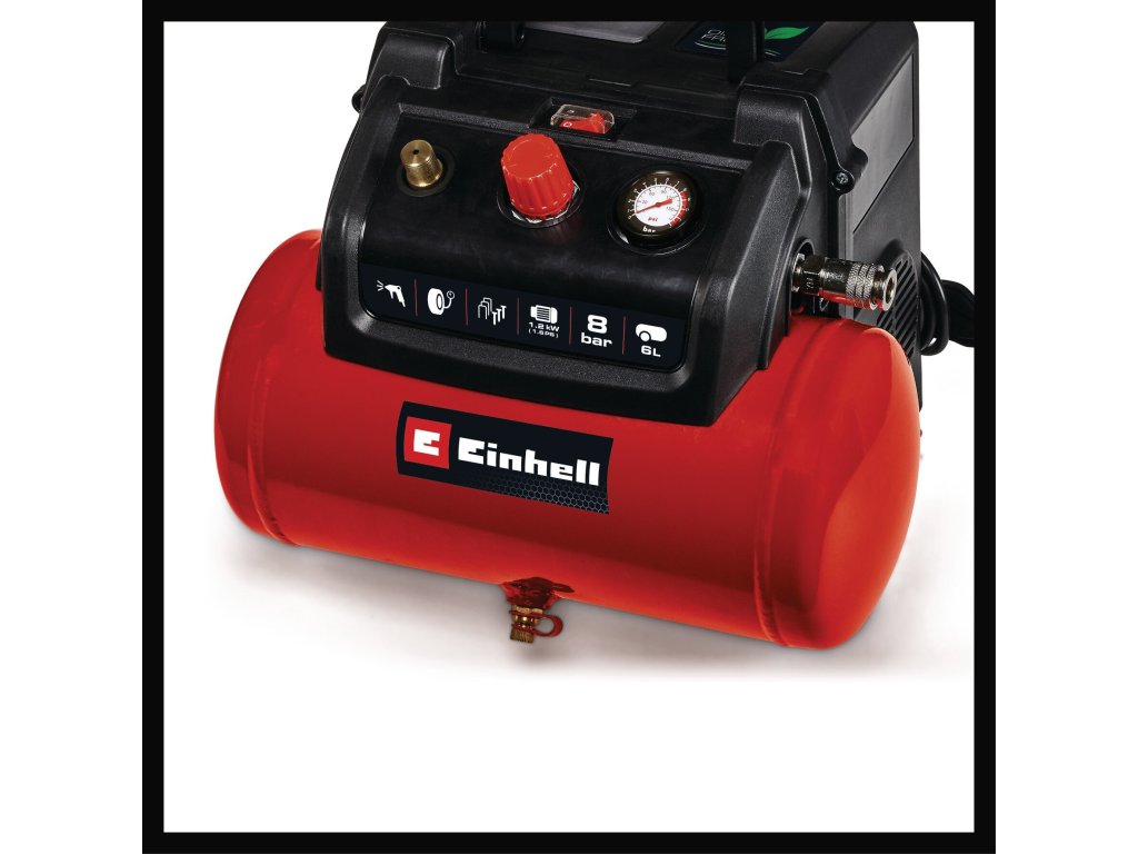 Kompresor Einhell TC-AC 190/6/8 OF Set je skutečně všestranným pomocníkem pro širokou škálu úkolů v domácnosti, dílně i garáži. Se správným nářadím lze kompresor použít k mnoha účelům: od lakování a mazání až po vyfukování a čištění. Pneumatiky, míče a matrace se během okamžiku naplní vzduchem. Bezolejový a bezúdržbový motor nevyžaduje velkou údržbu. Mobilní kompresor je vybaven šestilitrovou nádrží na stlačený vzduch, která umožňuje dlouhodobou práci. Praktické je navíjení kabelu na zadní straně krytu. V krytu je integrován háček a úložný prostor pro příslušenství. Díky redukčnímu ventilu, který lze nastavit až na 8 barů, zvládne kompresor širokou škálu aplikací. K dispozici je manometr a rychlospojka pro regulovaný pracovní tlak. Nožičky zajišťují bezpečný stoj během provozu. Bezpečnost uživatele zajišťuje bezpečnostní ventil. Vypouštěcí šroub umožňuje pohodlnou údržbu. Součástí vybavení je adaptér pro použití jako foukací pistole, nafukovačka pneumatik, pětimetrová spirálová hadice a osm různých adaptérů (např. pro míče, pneumatiky a vzduchové matrace). Společnost Einhell poskytuje desetiletou záruku na prorezavění kotle.