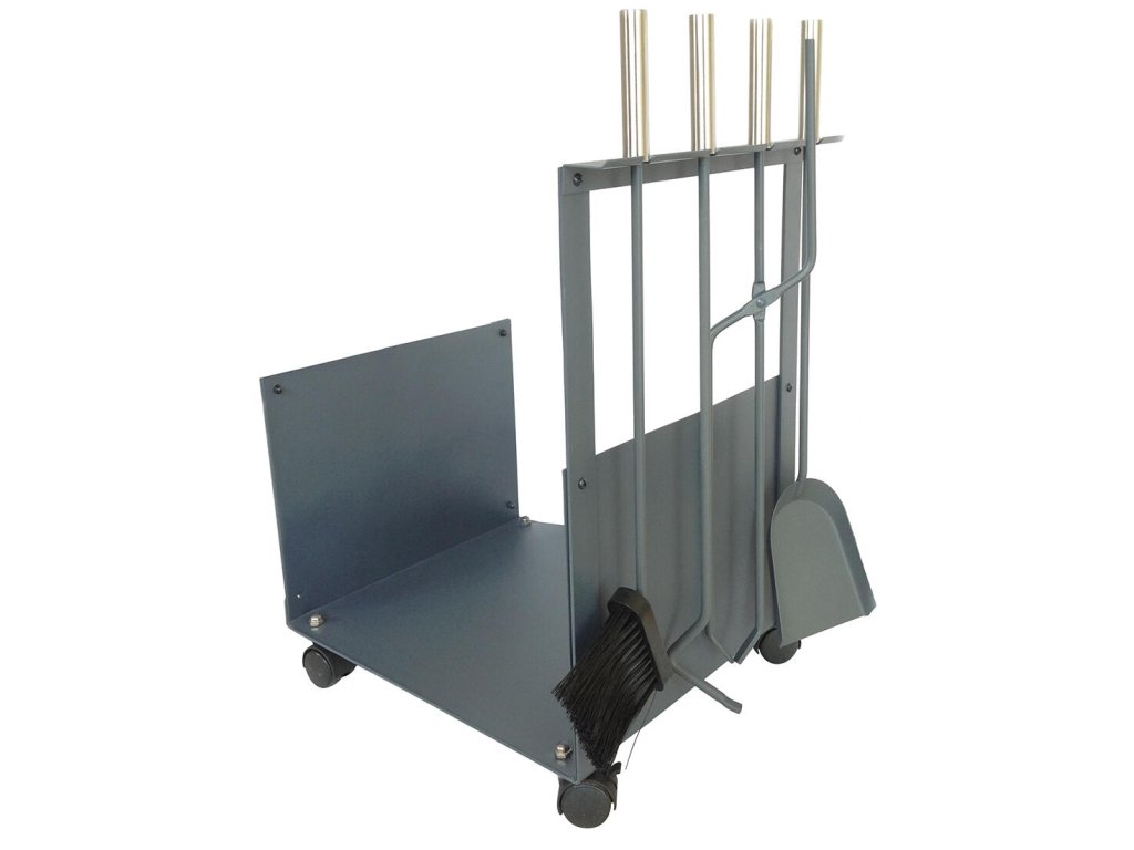 Krbové nářadí s košem na dřevo, který je praktickým pomocníkem pro přenos a uskladnění dřeva u krbu.