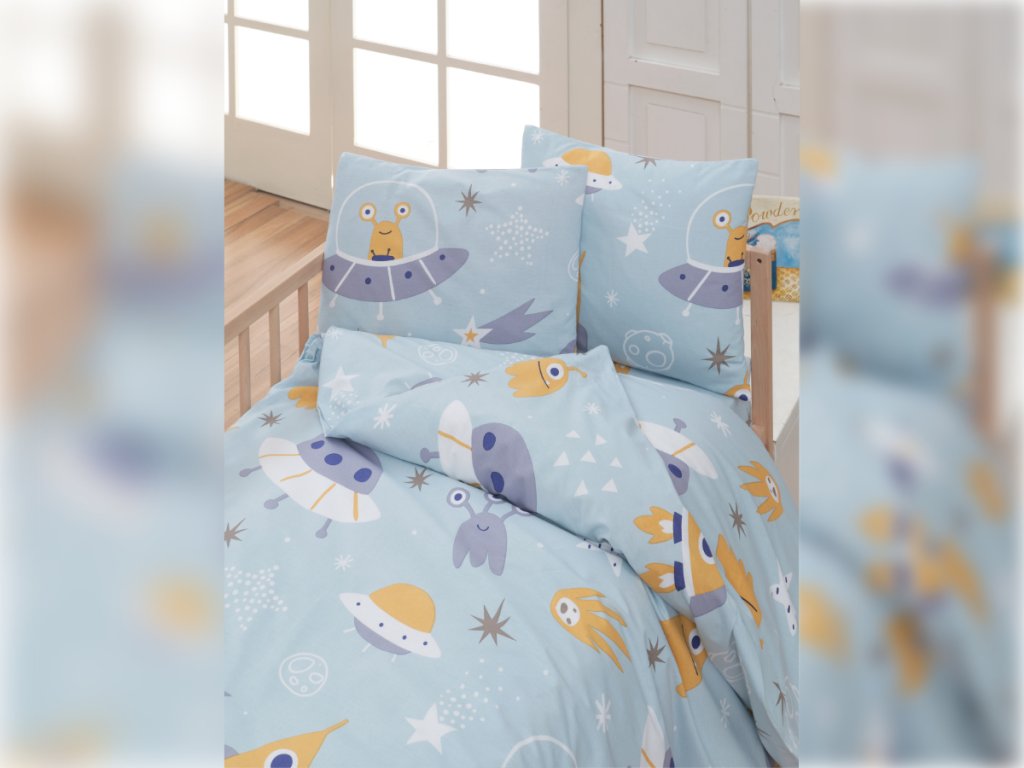 Toto dětské povlečení má zábavný a barevný vesmírný motiv, který nadchne malé objevitele. Na světle modrém podkladu jsou rozmístěny ilustrace raket, létajících talířů, planet, hvězd, komet a roztomilých mimozemšťanů v oranžové, bílé, fialové a šedé barvě. Některé rakety mají dokonce plameny, jakoby právě startovaly do vesmíru, což dodává vzoru dynamiku. Design je hravý, přitom ale přehledný a uklidňující díky pastelovým barvám. Povlečení je ideální pro děti, které milují vesmír, rakety a fantazii plnou dobrodružství. Hodí se do chlapeckých i dívčích pokojíčků a skvěle doplní moderní interiér.