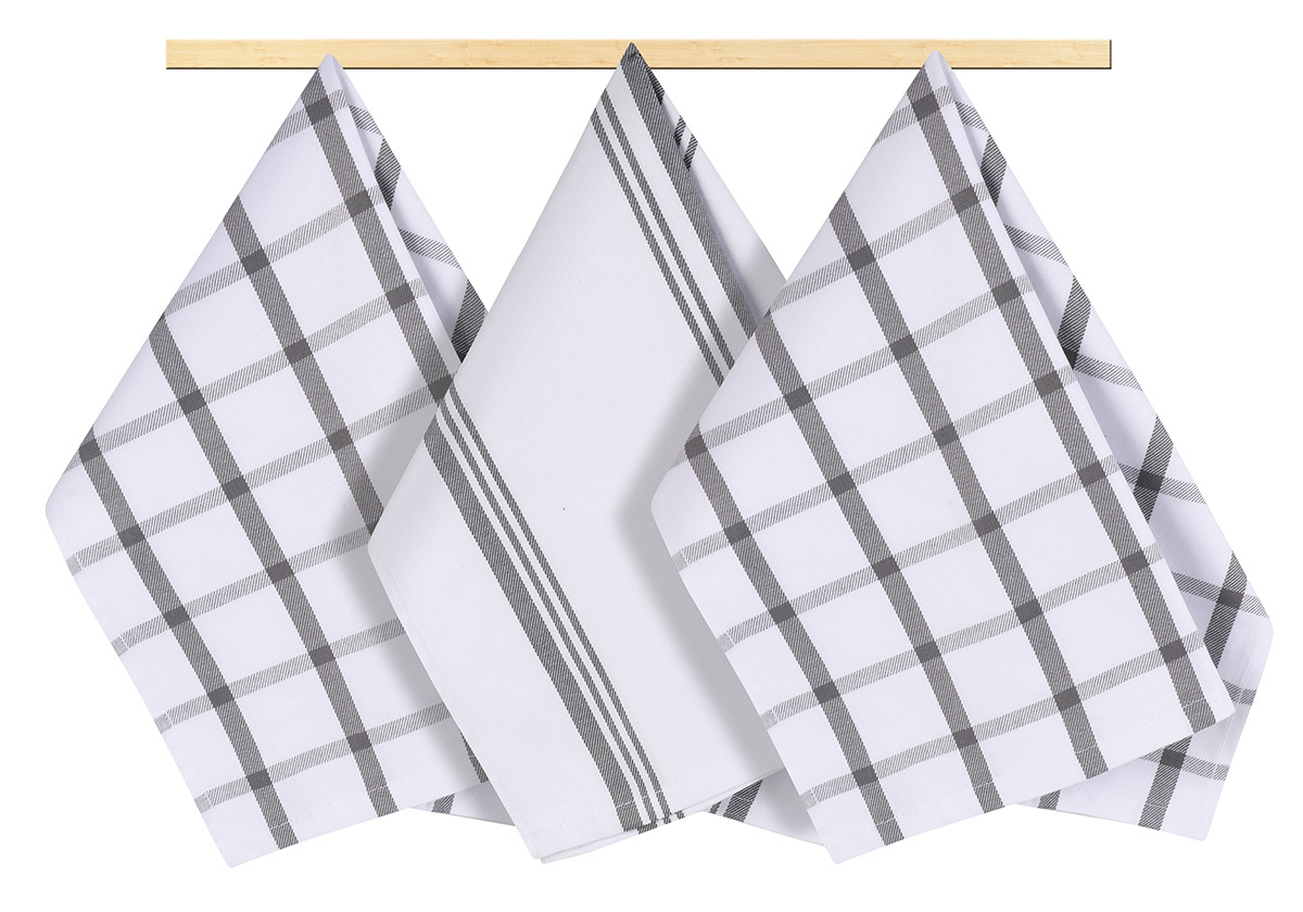 Kuchyňské utěrky jsou vyrobeny ze 100% bavlny o plošné gramáži 240g/m2. Jsou dostatečně velké a velmi dobře savé, v různých barevných variacích a dezénech. 100% bavlna zajišťuje dostatečnou savost použitého materiálu. Balení obsahuje tři kusy utěrek, barevnost utěrek může být odlišná oproti vyobrazení.