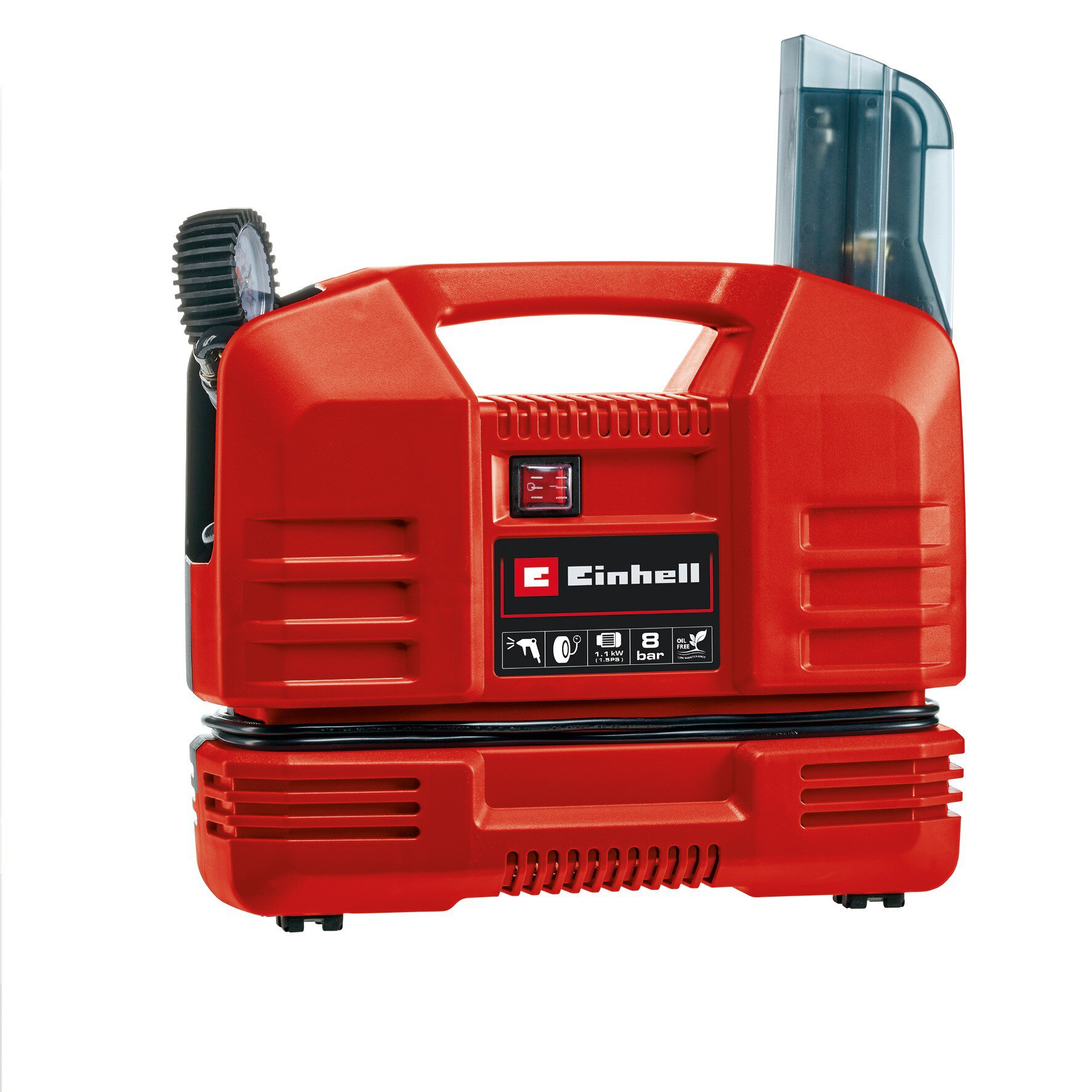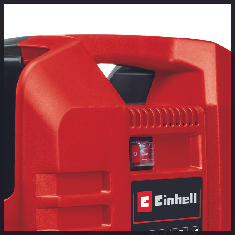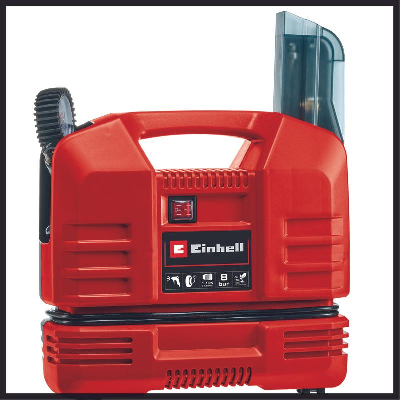 S přenosným kompresorem Einhell TC-AC 190 OF Set můžete být vybaveni na celou řadu praktických úkolů, kdykoli a kdekoli. Vysoce výkonný vzduchový kompresor má plochý design, snadnou obsluhu, je uživatelsky přívětivý a hodí se jak pro trvalé použití v dílně a garáži, tak jako "záloha" v autě. Kompaktní a praktický kompresor je ideální k mobilnímu huštění pneumatik automobilu, kol, motocyklu nebo jako "vzduchová pumpa" pro letní zábavu u vody. I v dílně se dokonale hodí k práci třeba v kombinaci s foukacím nástavcem pro čištění pracovních ploch. Nabídka společnosti Einhell zahrnuje široký sortiment praktického příslušenství ke kompresorům. Přenosný kompresor s maximálním tlakem 8 barů je poháněn bezolejovým motorem, jenž nevyžaduje servis a má malé nároky na údržbu. Kompaktní a lehká konstrukce usnadňuje přenášení. Pro skladování potřebuje jen malý prostor. Na krytu je umístěno navíjení kabelu, integrovaný úložný prostor pro hadici a foukací pistoli, stejně jako další úložný box pro adaptéry. Výrobek je dodáván s 3metrovou hadicí na stlačený vzduch s rychlospojkou, foukací pistolí s manometrem na měření tlaku a 3dílnou sadou adaptérů.
