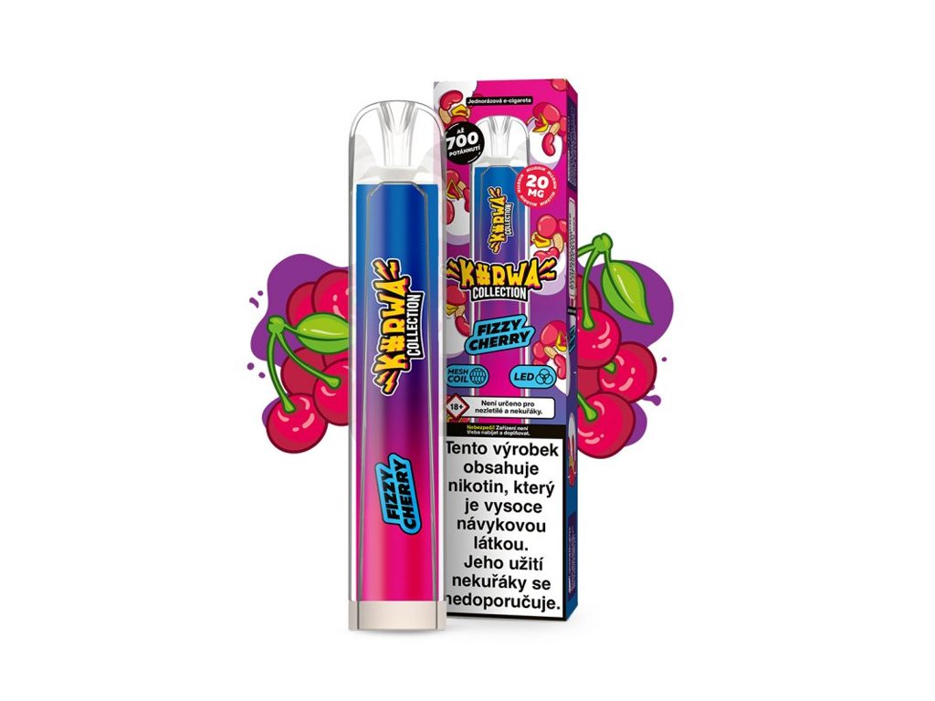 Obsah balení: 1x jednorázová e-cigareta Příchuť: Třešeň Síla nikotinu: 20 mg/ml Životnost baterie: až 700 potahů Objem: 2 ml Odpor: 1,7 ohm Napětí: 3,7 V Kapacita baterie: 500 mAh Hmotnost: 35 g Podsvícení: LED dioda Žádné další potřeby! Je to jednoduché. Tato jednorázová e-cigareta z kolekce Kurwa Collection je připravena k okamžitému použití. Nepotřebujete žádné další vybavení, stačí ji pouze vytáhnout a užívat si neodolatelnou chuťovou kombinaci Kurwa cigaret. S touto jednorázovou e-cigaretou se kouření stává jednoduchým a bezstarostným zážitkem. Pouze pro osoby starší 18 let. Tento výrobek obsahuje nikotin, který je vysoce návykovou látkou. Jeho užití nekuřáky se nedoporučuje.Doplňkové parametry