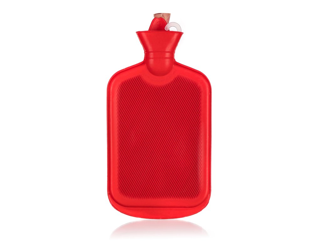 Zahřívací láhev v červené barvě je včetně textilního návleku.
