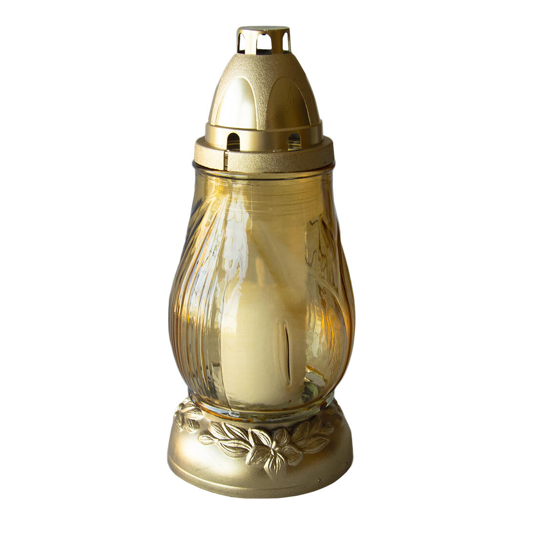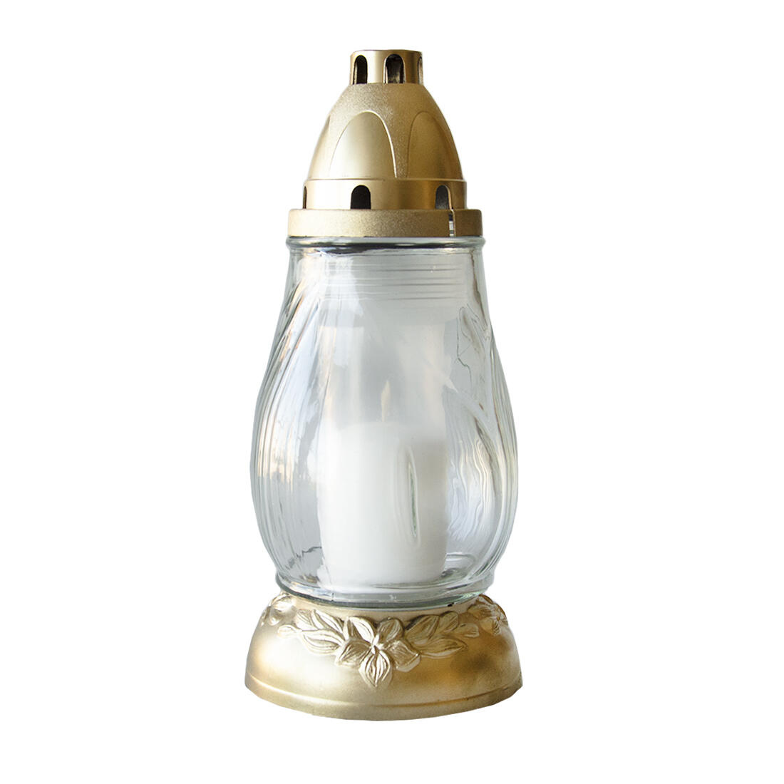Skleněná hřbitovní lampa na svíčky 24 cm s kuželovitým víkem proti dešti a proti uhašení plamínku větrem.