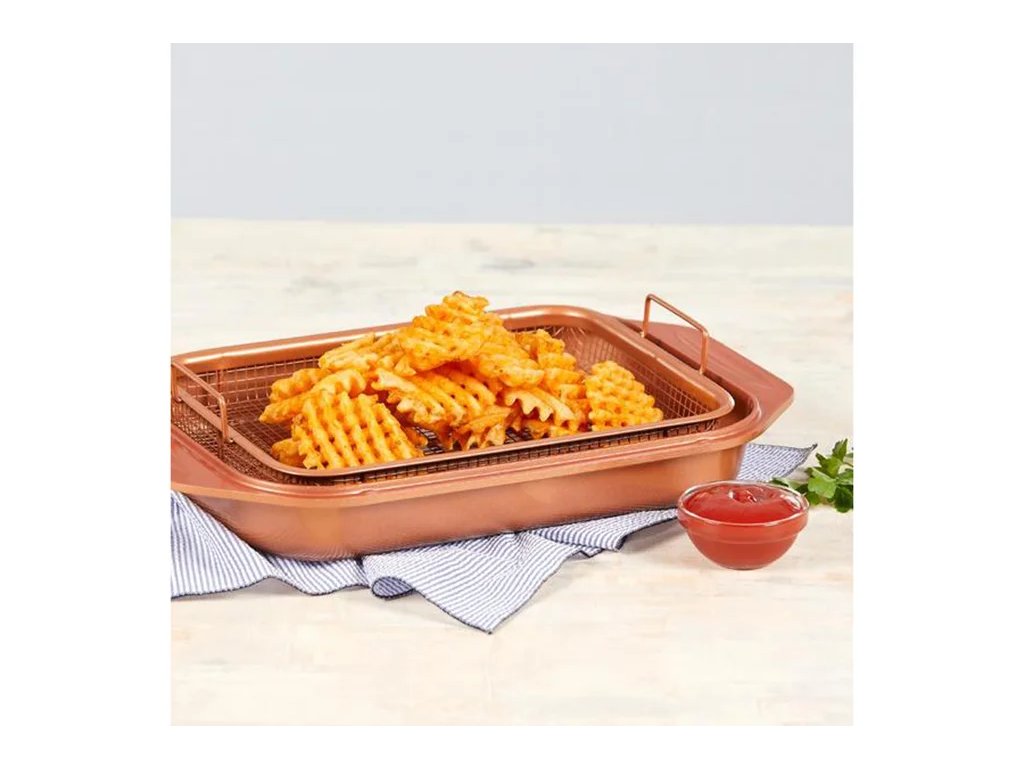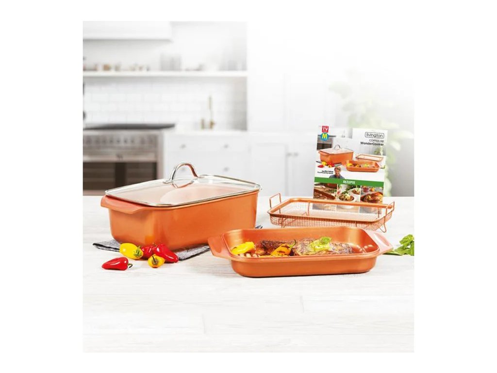 Vítejte v kuchařském ráji s Livington Copperline WonderCooker! Tento kuchyňský zázrak 4 v 1 kombinuje neuvěřitelných 14 funkcí v jednom zařízení, od hlubokého pekáče až po grilovací pánev. S ním si přivedete do kuchyně vše, co potřebujete pro skvělá jídla. Nejenže můžete péct krocana ve vysokém pekáči a dusit žebra na mělkém pekáči, ale také připravit skvělé smažené hranolky s využitím horkého vzduchu díky Copper Crisperu. Tento originální produkt, který jste mohli vidět i v televizi, vám otevře nové možnosti vaření.