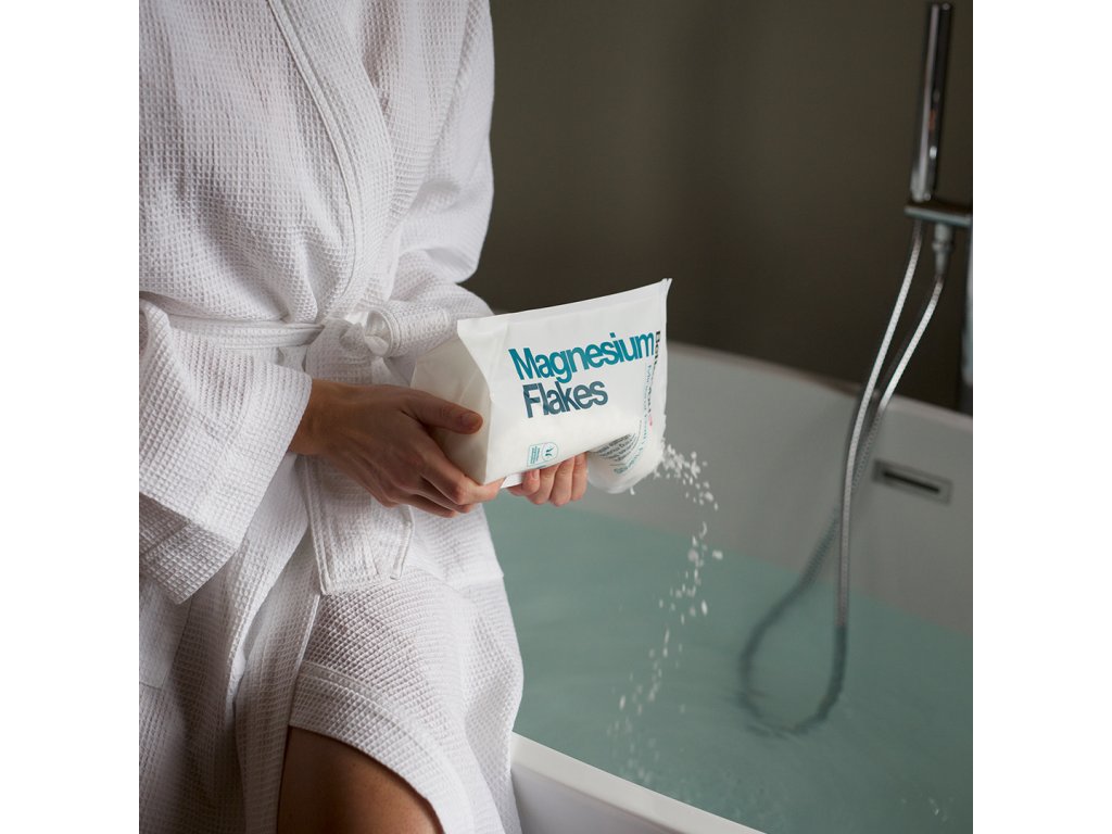 Lázeň: Přidejte 250g Magnéziových (hořčíkových) vloček (zhruba 2 šálky) do vany. Lehněte si a relaxujte alespoň 20 minut. Zvyšte dávku pro intenzivnější zážitek.
