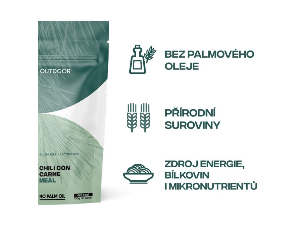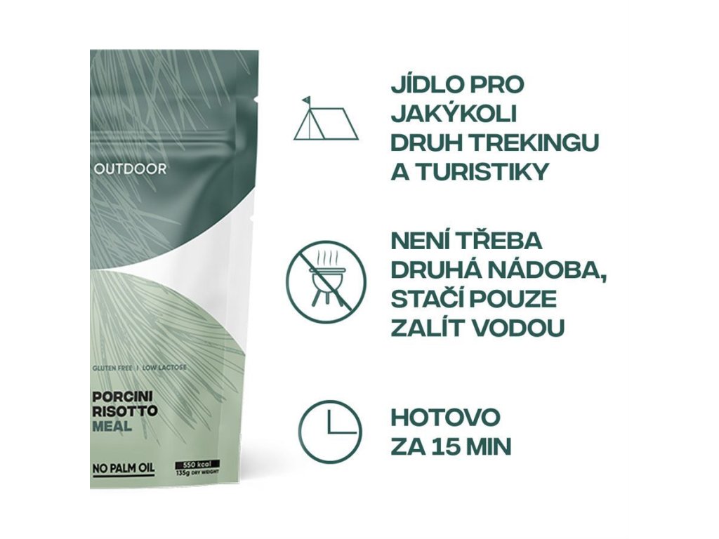Chutné a syté jídlo pro jakýkoli typ turistiky. Lze jej kompletně připravit v sáčku, stačí přidat vodu a na 15 minut zase uzavřít. Sáček je vodotěsný a hmyzutěsný, je vyrobený tak, aby nehrozilo pořezání. Jídlo si tak můžete vychutnat bez zbytečné dlouhé přípravy a mytí. pokrm je bez palmového oleje, bez lepku a bez laktózy. Je připravené z přírodních složek, má komplexní výživový profil - v jedné 540 g porci najdete 68 g sacharidů, 19 g bílkovin, 10 g vlákniny a také antioxidanty - alfa tokoferol a extrakt z rozmarýnu. Pokrm neobsahuje umělá sladila nebo glutamát.