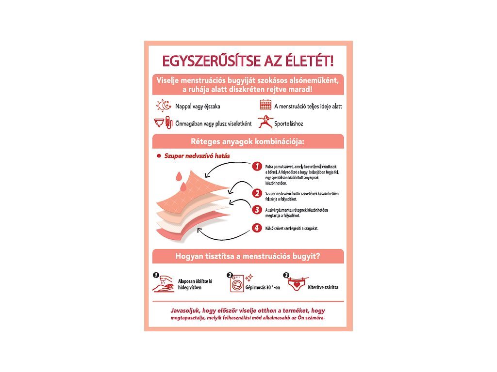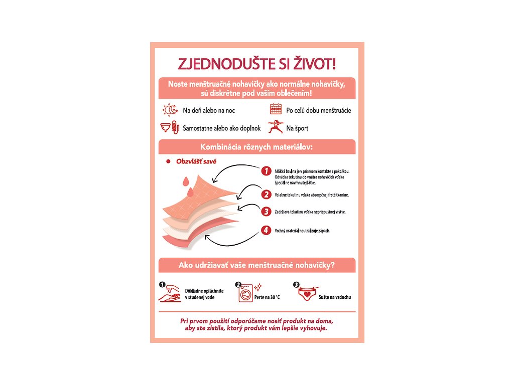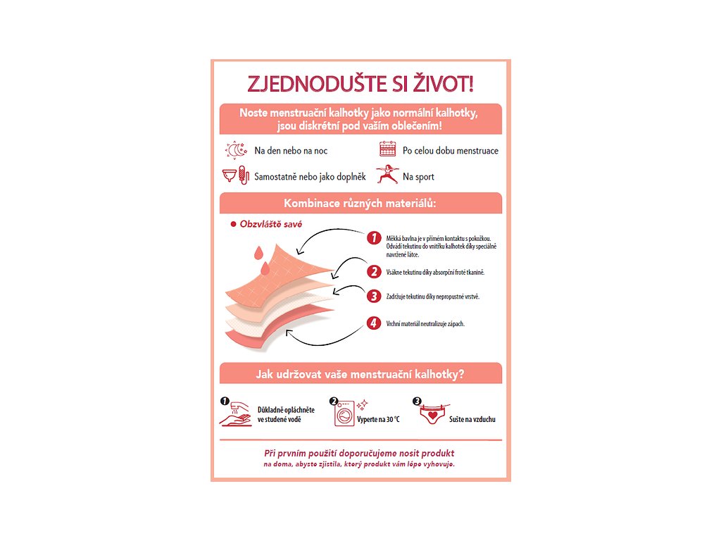 Bavlněné menstruační kalhotky (boxerky), které Vám zajistí dokonalou svobodu a pohodlí. Tyto kalhotky jsou příjemnou alternativou, která je zdravá i ekologická. Jejich technologie Vás ochrání proti úniku i zápachu. Poskytují až 12 hodin ochrany po celý cyklus. Kalhotky lze prát v pračce na 30 °C. Díky plochým švům jsou neviditelné pod oblečením.