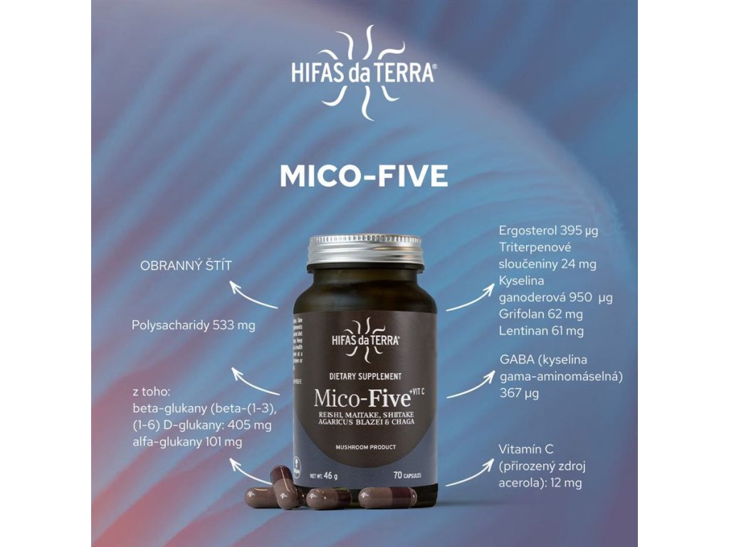 Originální produkt evropského původu s vysokou potencí a garantovaným obsahem bioaktivních složek. Vysokoprocentní BIO extrakt z Reishi vyráběný pod ochrannou známkou Ganozumib® (HdT extract of Ganoderma lucidum HdT488 DSM 32782), vysokoprocentní BIO extrakt z Maitake vyráběný pod ochrannou známkou Grifolumib®, vysokoprocentní BIO extrakt z Shiitake, Žampionu a Chagy. Prémiová kvalita, čistota a funkčnost je garantována více než dvacetiletou tradicí a dobrým jménem přímého výrobce (vlastní biotechnologické a vývojové laboratoře) a také pěstitele (vlastní mykorhizní les a ekofarma) = etická produkce a kontrola celého výrobního procesu od A po Z.