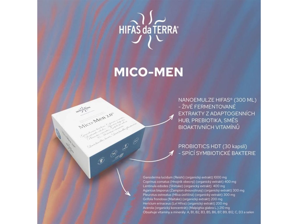 Mico-Men 300ml a 30 kapslí (Reishi, Hnojník, Shiitake, Žampion, Hlíva, Maitake, Hericium)