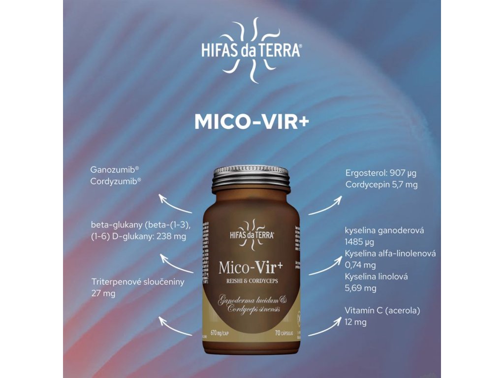 Mico-VIR+ obsahuje extrakty z Reishi, které se soustředí na akutní období, zatímco extrakt z Cordycepsu je určený pro období následující.