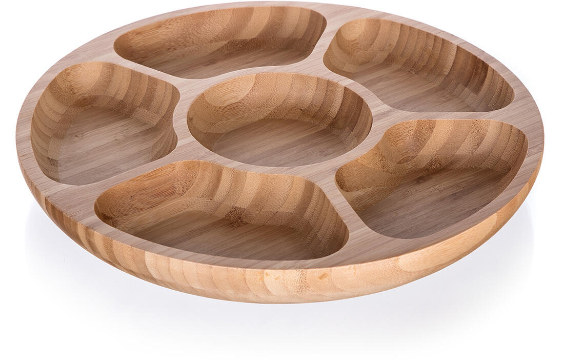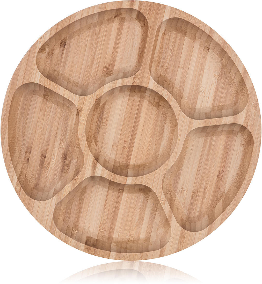 Díky děleným dřevěným přepážkám je možné servírovat více druhů pochutin na jedné misce.