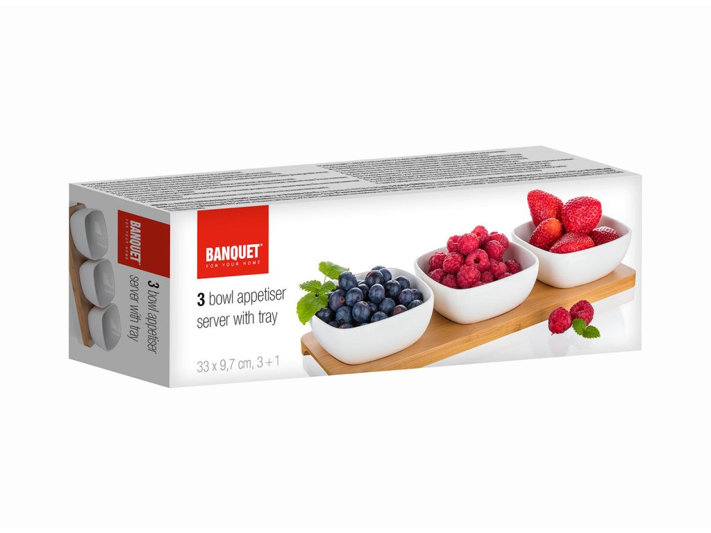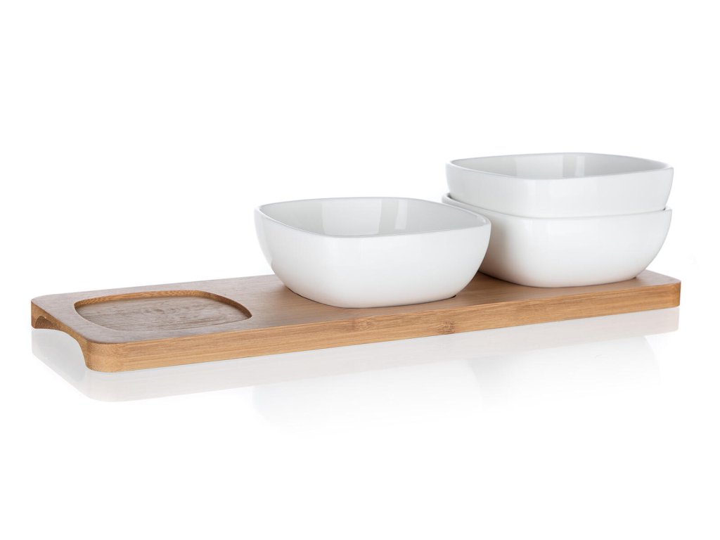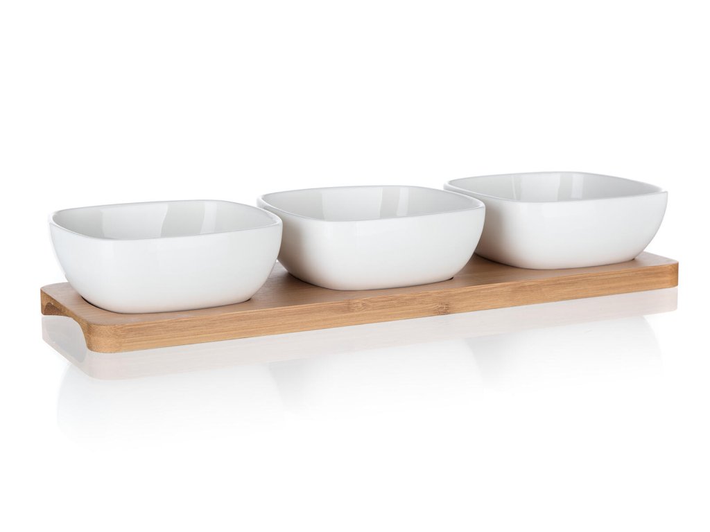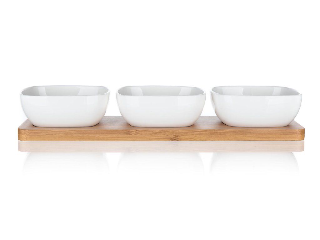 Sada tří hranatých porcelánových misek, na bambusovém podnosu, o celkových rozměrech 33 x 9,7 x 4,7 cm, je ideální pro servírování různých druhů oříšků, sušeného ovoce, oliv apod.