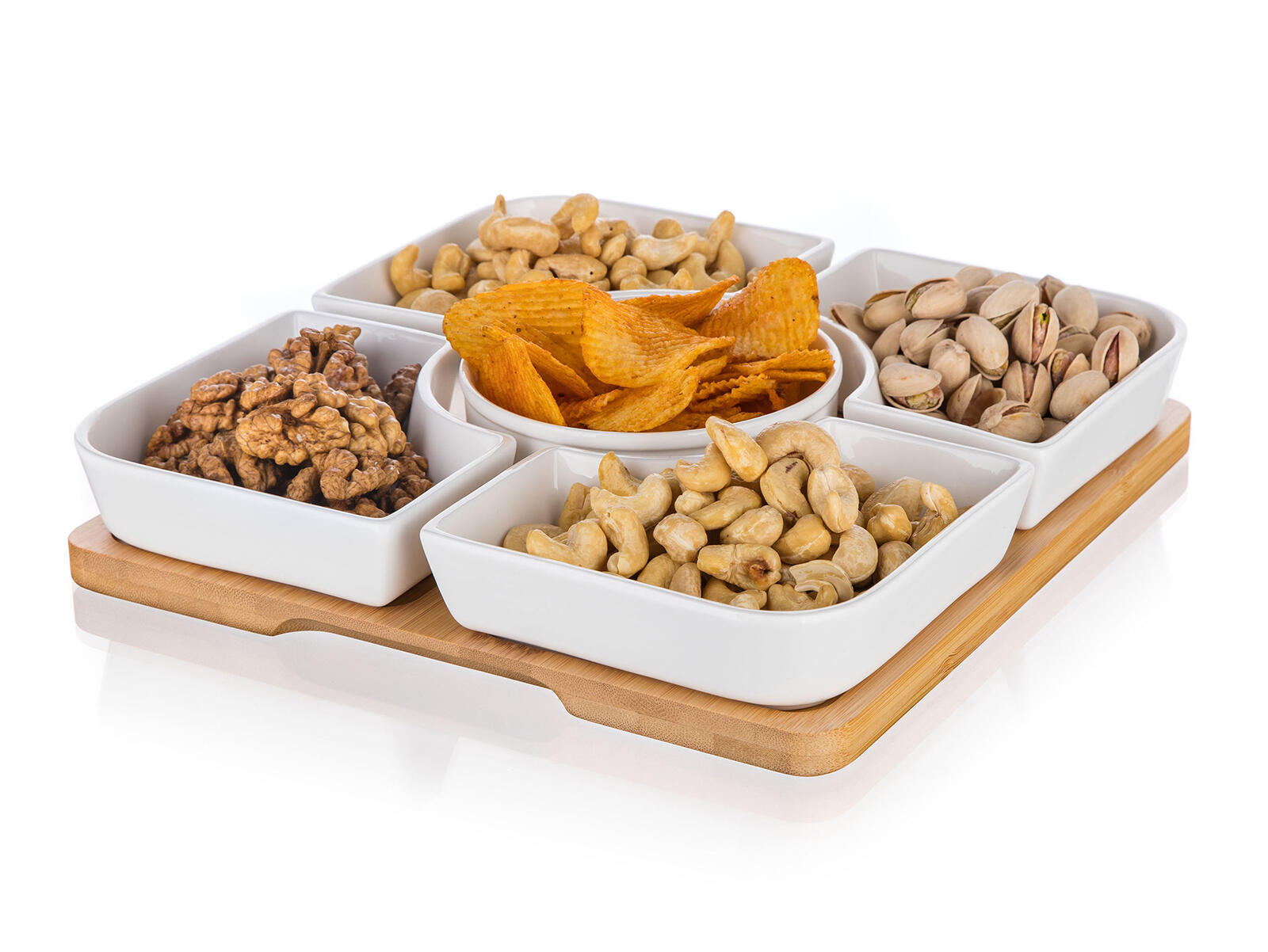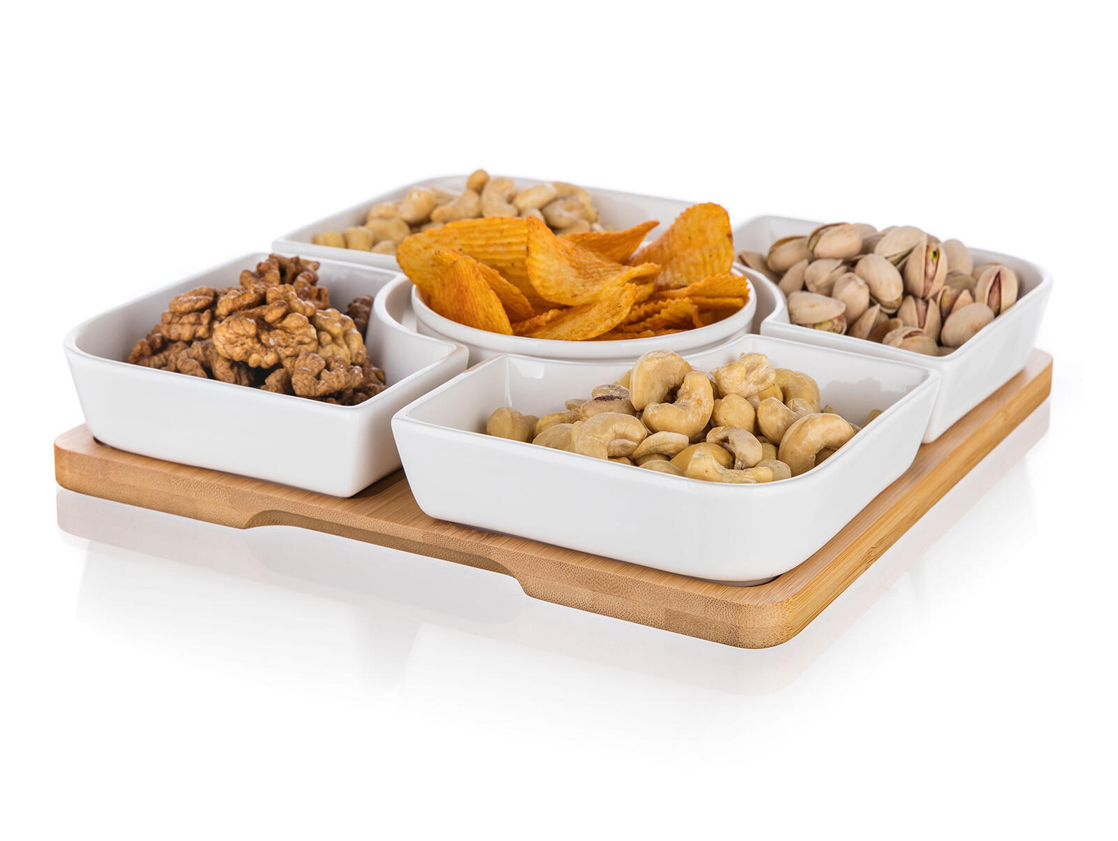 Sada pěti hranatých a jedné kulaté porcelánové misky, na čtvercovém bambusovém podnosu, o celkových rozměrech 24,5 x 24,5 x 4,5 cm, je ideální pro servírování různých druhů oříšků, sušeného ovoce, oliv apod.