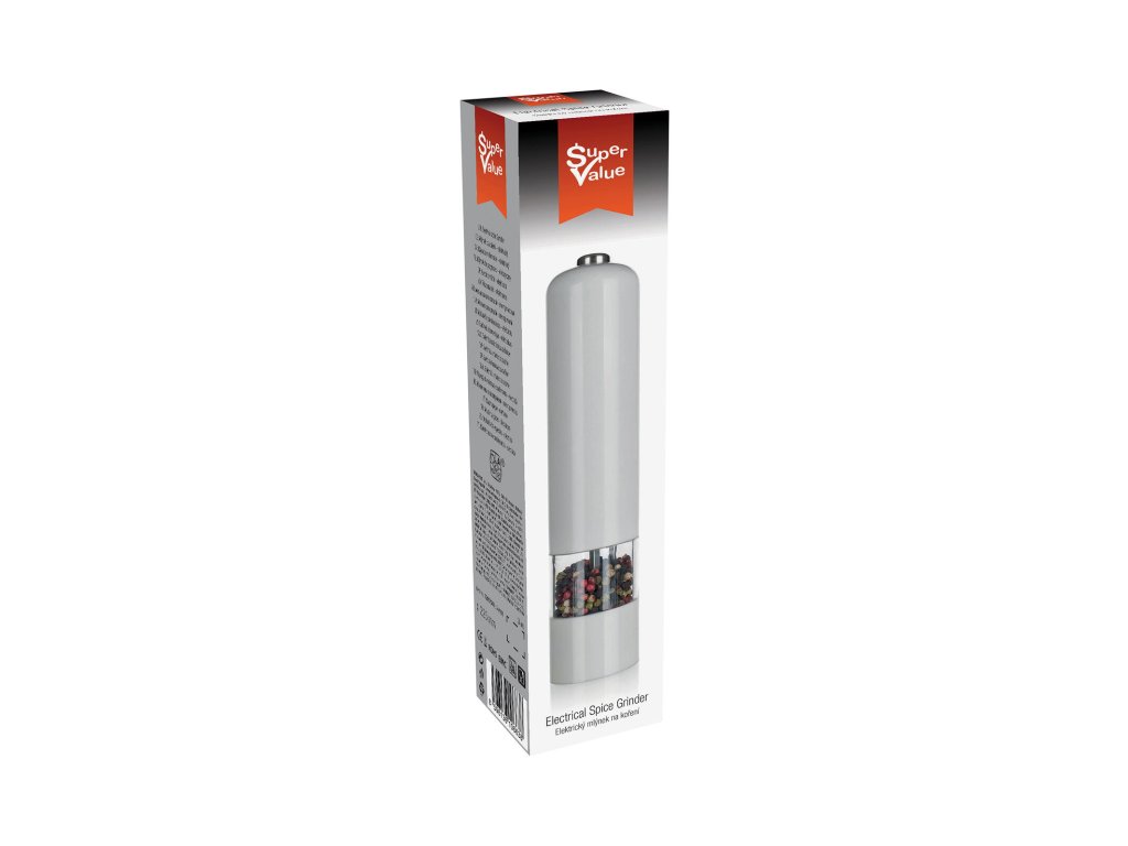 Elektrický mlýnek na koření SUPER VALUE je dodáván v plastovém provedení, zásobníky jsou akrylové.