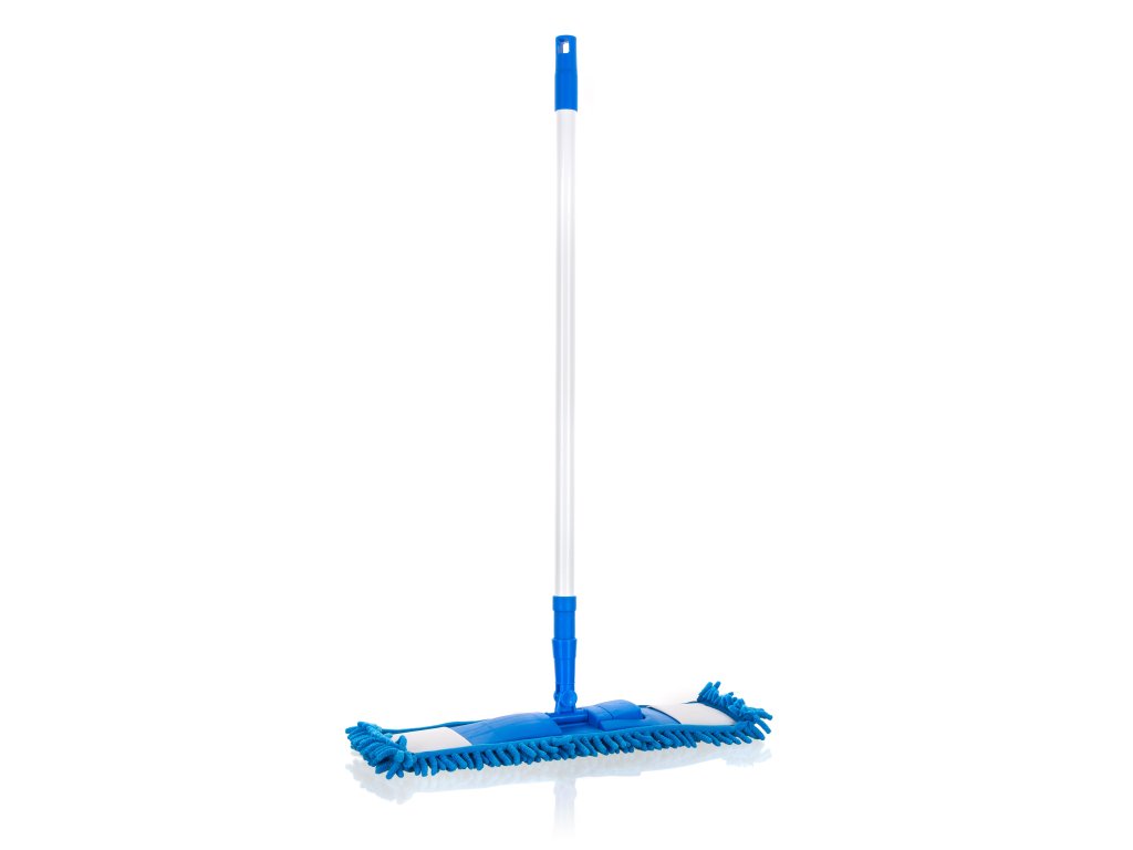 Mop plochý žinylkový o rozměru 42 x 13 cm, s teleskopickou tyčí 68 - 120 cm, barva mopu tmavě modrá.