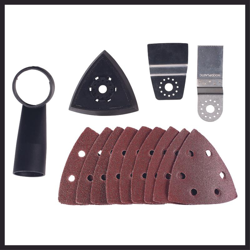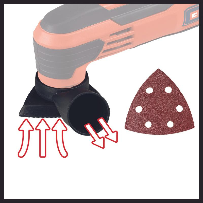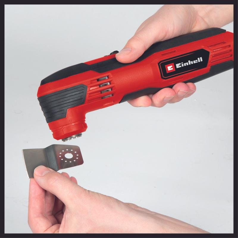Multifunkční přístroj Einhell TC-MG 250 CE je kompaktní univerzální přístroj, který podporuje ambiciózní kutily při stavebních úpravách, renovacích a rekonstrukcích. Řezání, broušení, škrábání a mnoho dalšího je s tímto praktickým univerzálním nářadím rychlé a snadné. Výkonný 250W motor nabízí dostatečný výkon pro náročné projekty a elektronika otáček umožňuje práci přizpůsobenou materiálu a použití. Konstantní elektronika zajišťuje stálý výkon. Magnetický držák nástrojů nastavitelný ve 12 směrech umožňuje snadnou výměnu a optimální umístění příslušenství. Spínač s funkcí aretace usnadňuje delší práci. Multifunkční přístroj má úhel oscilace 3° a díky štíhlému ergonomickému designu s povrchem Softgrip se vždy pohodlně a bezpečně drží v ruce. Dodávané zařízení pro odsávání prachu lze namontovat bez použití nářadí. Součástí dodávky je ponorný pilový kotouč na dřevo a plast a šestihranný klíč pro výměnu nástroje. Kromě toho dodávka obsahuje trojúhelníkovou brusnou desku, devět brusných papírů (3x K60, 3x K80, 3x K120) a škrabku.