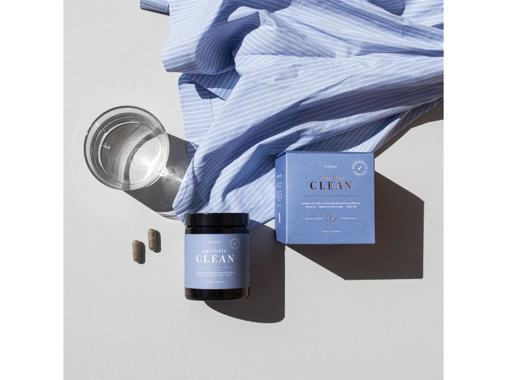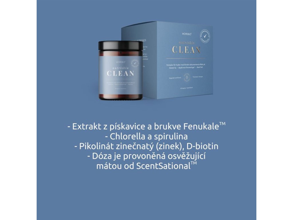 Nutriskin Shape je přírodní kapslový doplněk pro podporu čistoty pleti. Obsahuje extrakt z pískavice a brukve FenukaleTM bohatý na přírodní sloučeniny, které chrání pokožku před nečistým vnějším prostředím, které zrychluje stárnutí. Látky obsažené v extraktu mají vlastnosti související s prevencí epigenetických změn a zánětlivostí. Účinek extraktu byl ověřen v kontrolované klinické studii. Nutriskin Clean dále obsahuje chlorellu a spirulinu, které obsahují chlorofyl a celou řadu dalších přírodních sloučenin s antioxidačním účinkem, a také zinek a D-biotin podporující stav pokožky.