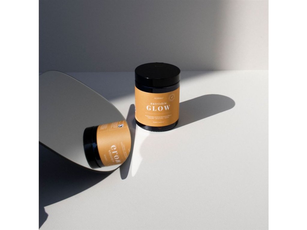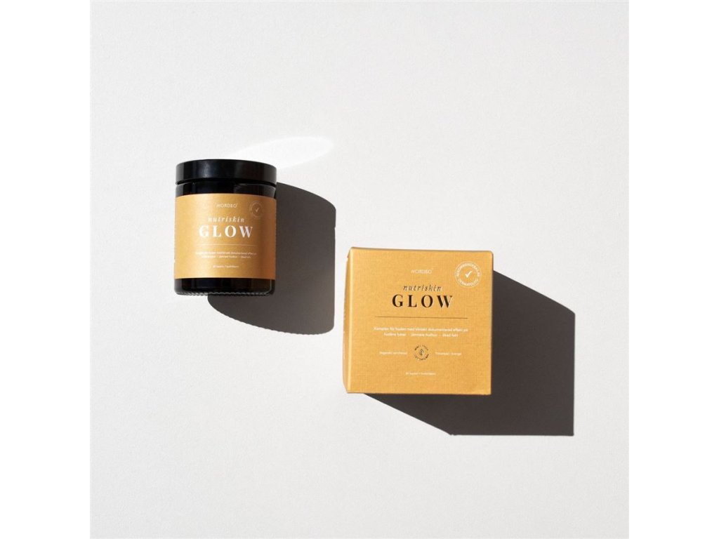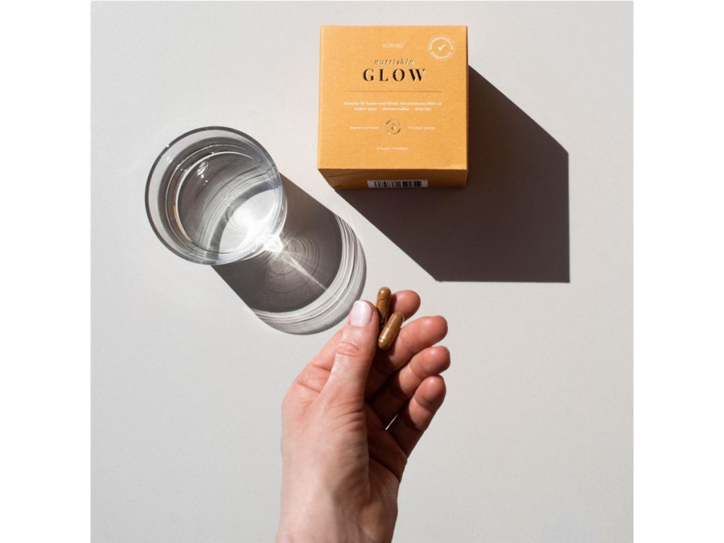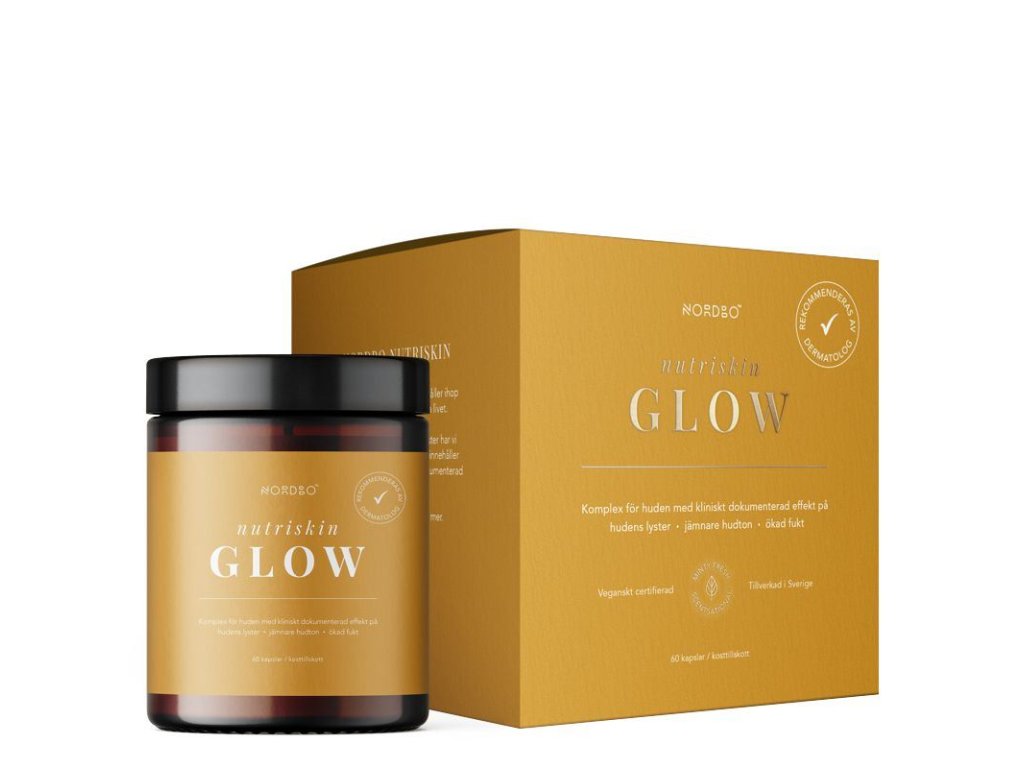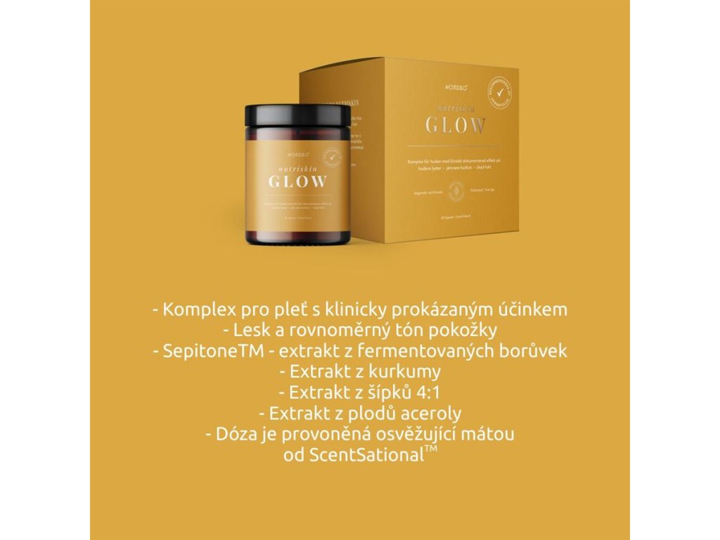 Nutriskin Glow je přírodní kapslový doplněk pro unavenou a suchou pleť. Nutriskin obsahuje výhradně účinné přírodní složky - unikátní přírodní extrakty zaměřené na lesk a rovnoměrný tón. SepitoneTM je standardizovaný extrakt z fermentovaných borůvek s komplexem proantokyanidinů a antokynidinů, velmi silných přírodních látek, jejichž vlastnosti souvisejí s oxidativním stresem, tvorbou kolagenu, elasticitou a oběhem. Extrakt z kurkumy obsažený v Nutriskin Glow obsahuje 95 % (!) kurkumionoidů - účinných látek zaměřených na oblast oxidativního stresu. Podobné vlastnosti má i extrakt ze šípku a extrakt z plodů aceroly.