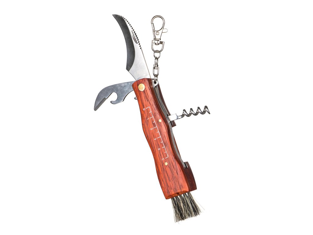 Nožík je skládací a obsahuje štěteček k očištění hub, nůž s ostrou čepelí, karabinku a vývrtku.