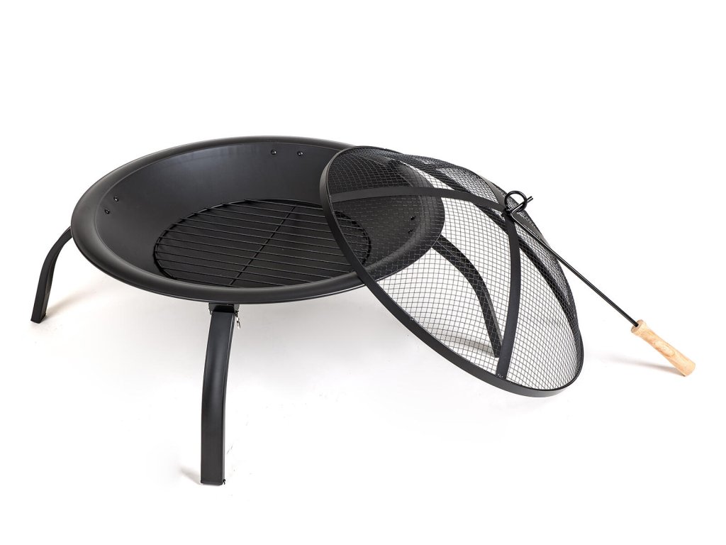 Přenosné kovové zahradní ohniště, plochého typu, se zabudovaným roštem.