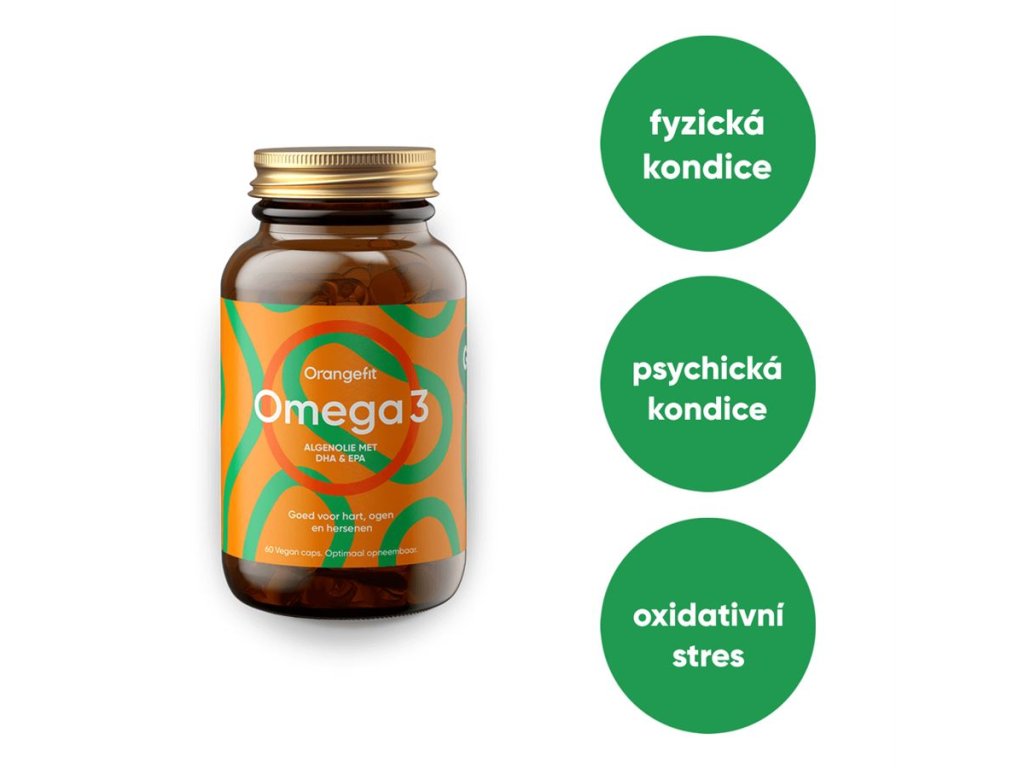 Omega-3 nenasycené mastné kyseliny DHA a EPA jsou stavebními látkami celého těla, včetně srdce, očí a mozku. Orangefit Omega-3 jsou získané pouze z rostliny - z velice speciální řasy pěstované v separátních nádržích bez znečištění z oceánů a živočišných složek. Jako zdroj je použita mikrořasa Schizochytrium, která je na DHA a EPA přirozeně bohatá. Doplněk je obsahuje v poměru 2:1 - ve dvou kapslích celkem 300 mg DHA a 150 mg EPA.