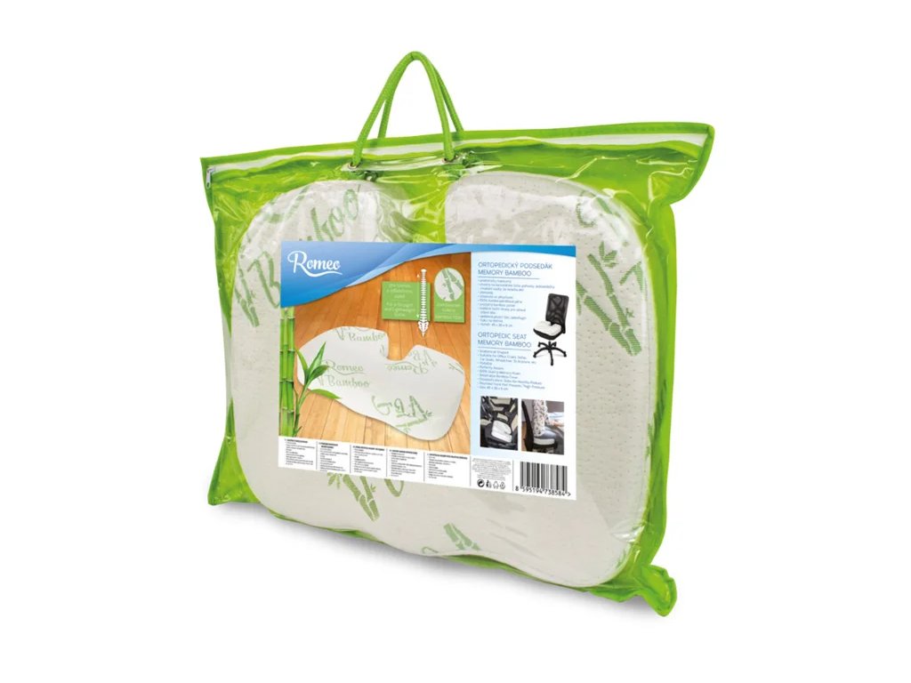 Ortopedický podsedák MEMORY BAMBOO 45 x 36 x 6 cm Anatomicky tvarovaný ortopedický podsedák vhodný na kancelářské židle, pohovky, autosedačky, invalidní vozíky, do letadla... Ortopedický podsedák MEMORY BAMBOO díky svému tvaru odlehčí páteři, snižuje tlak na kostrč a kyčle, ke kterému v sedě dochází. Ortopedický podsedák MEMORY BAMBOO napomáhá správnému držení těla, pomáhá eliminovat problémy s dolní části zad, s bolestmi kostrče, hemoroidy, poranění páteře, uplatnění najde také v těhotenství.