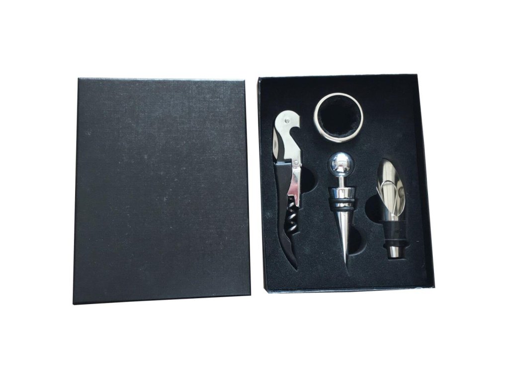 Čtyřdílná sada obsahuje otvírák na lahve s vývrtkou a nožíkem, uzávěr na lahve, kroužek na hrdlo láhve, nálevku.
