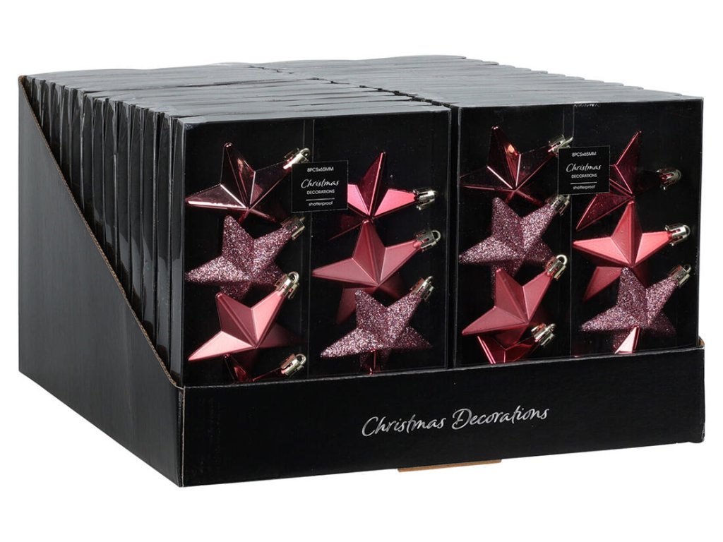 Vánoční sada obsahuje závěsné růžové ozdoby ve tvaru hvězdy.