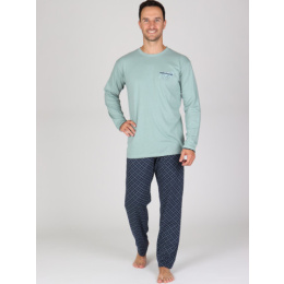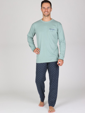 Pohodlné bavlněné pánské dlouhé pyžamo se skládá z jednobarevného trika s dlouhým rukávem a z dlouhých kalhot s károvým potiskem. Triko má na předním díle drobný potisk.
