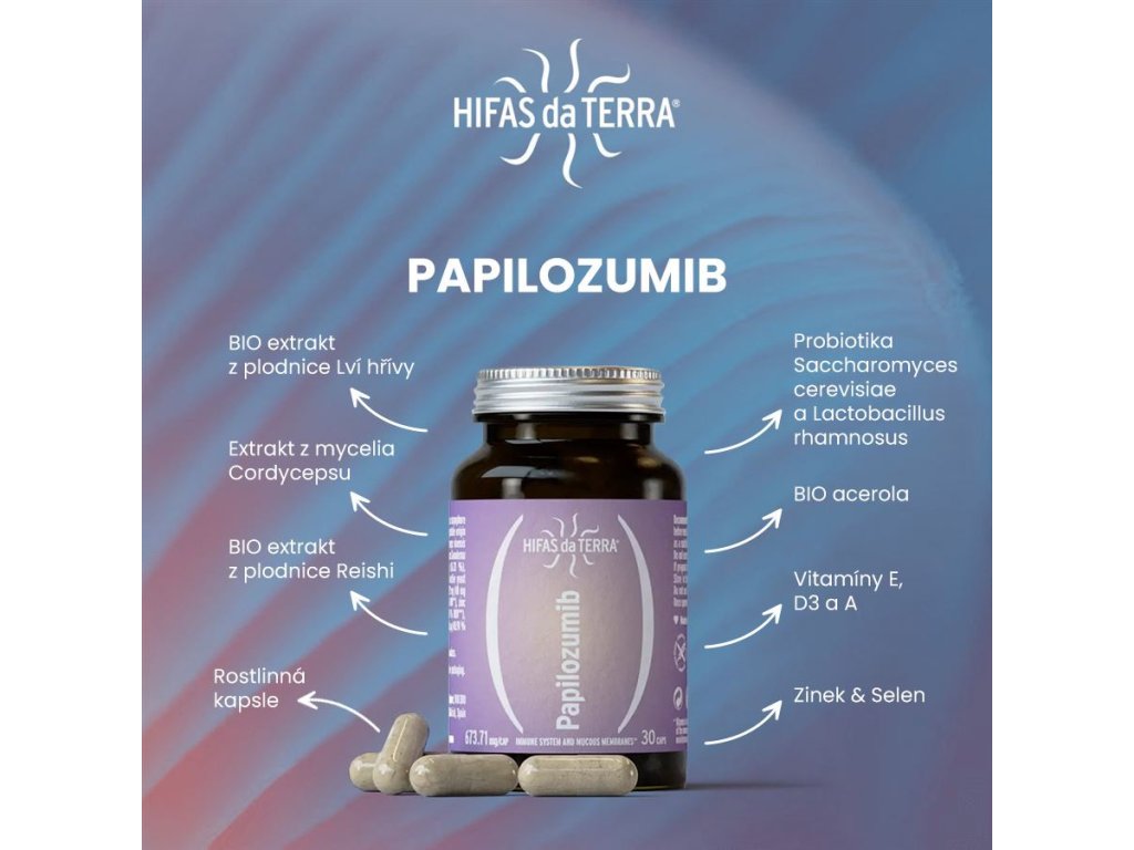 Papilozumib je přírodní doplněk stravy kombinující vysoce účinné extrakty z adaptogenních hub Lví Hříva, Cordyceps a Reishi používaných po tisíciletí ve východní medicíně s pečlivě vybranými minerály, vitamíny a probiotickými kmeny. Papilozumib je speciálně zaměřený na posílení obranného štítu v konkrétních problematických případech (viz název produktu) a také na posílení vaginálního mikrobiomu.