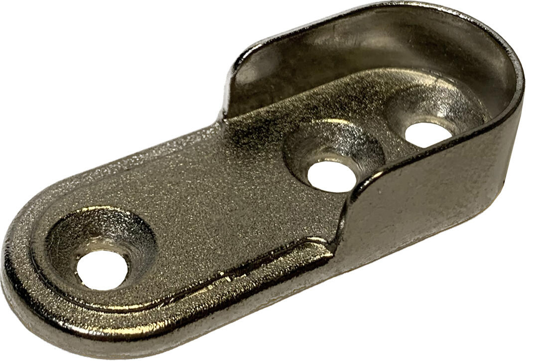 Kovová podpěrka oválné šatní tyče k přišroubování, dodávaná bez vrutů k uchycení.