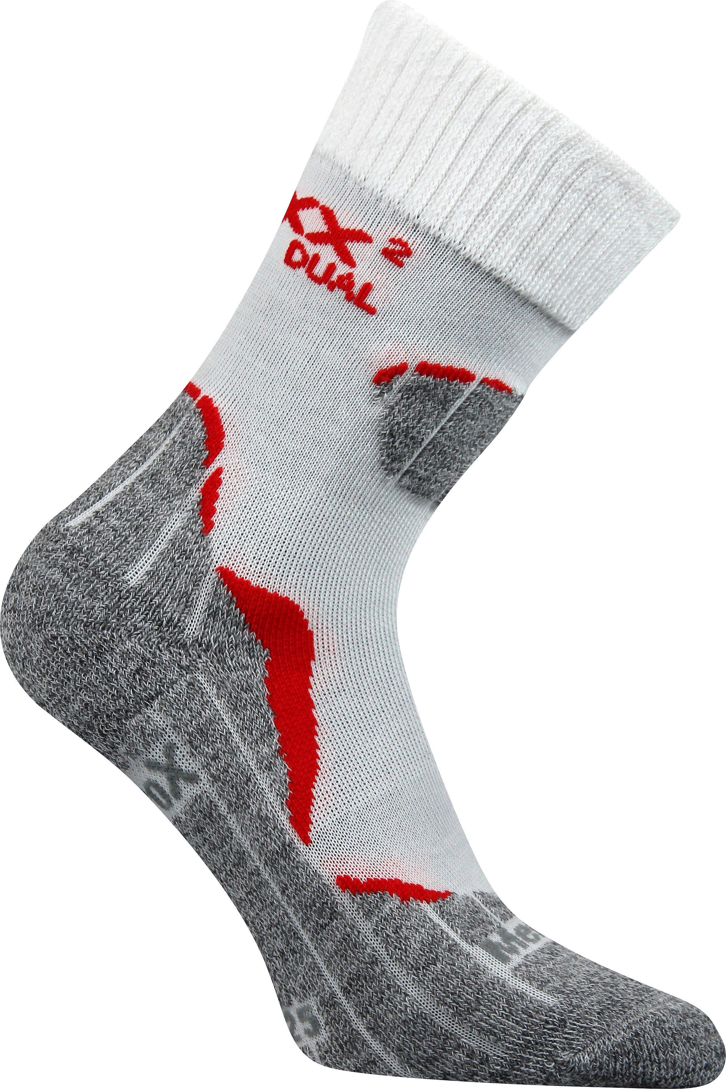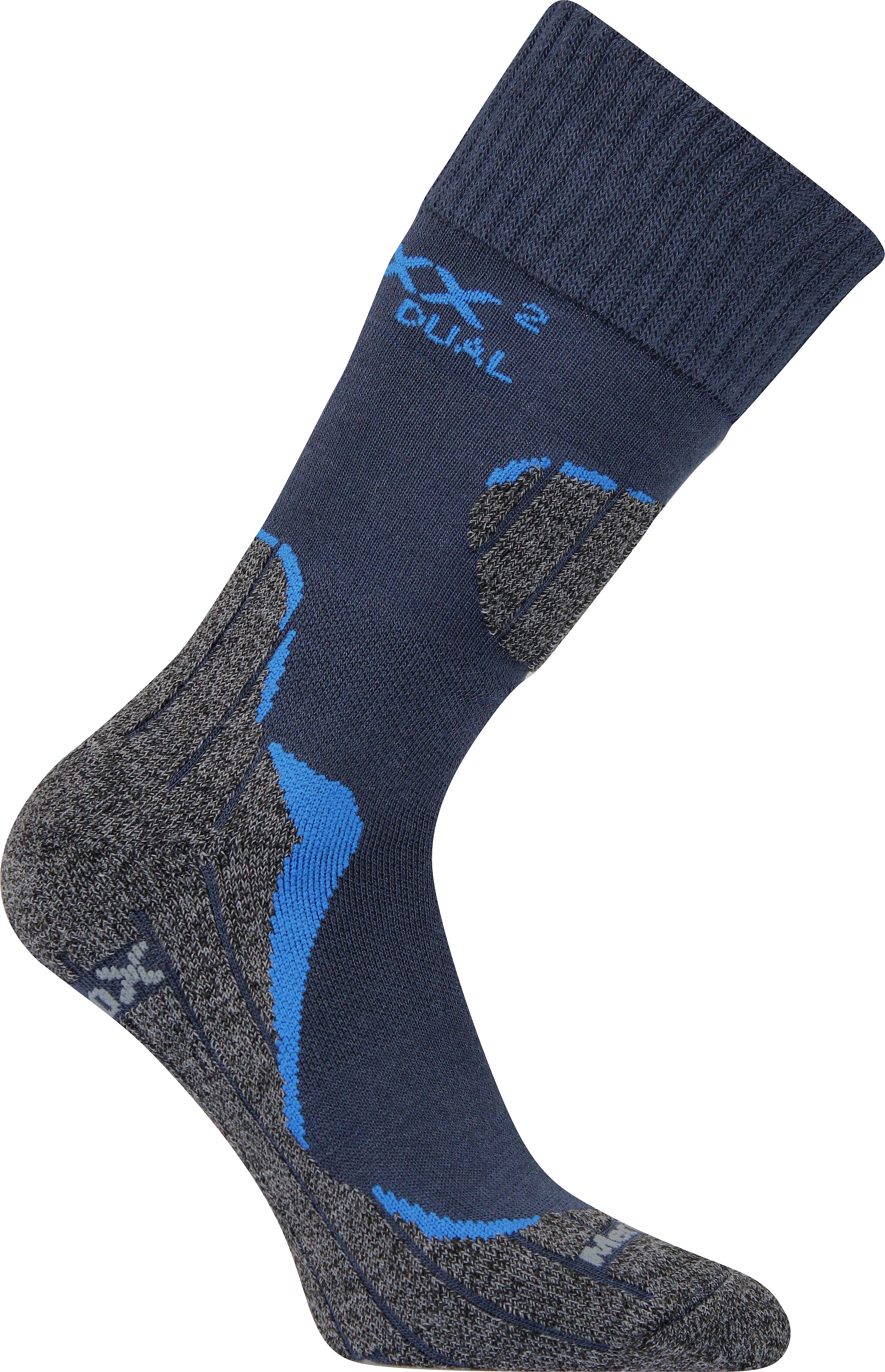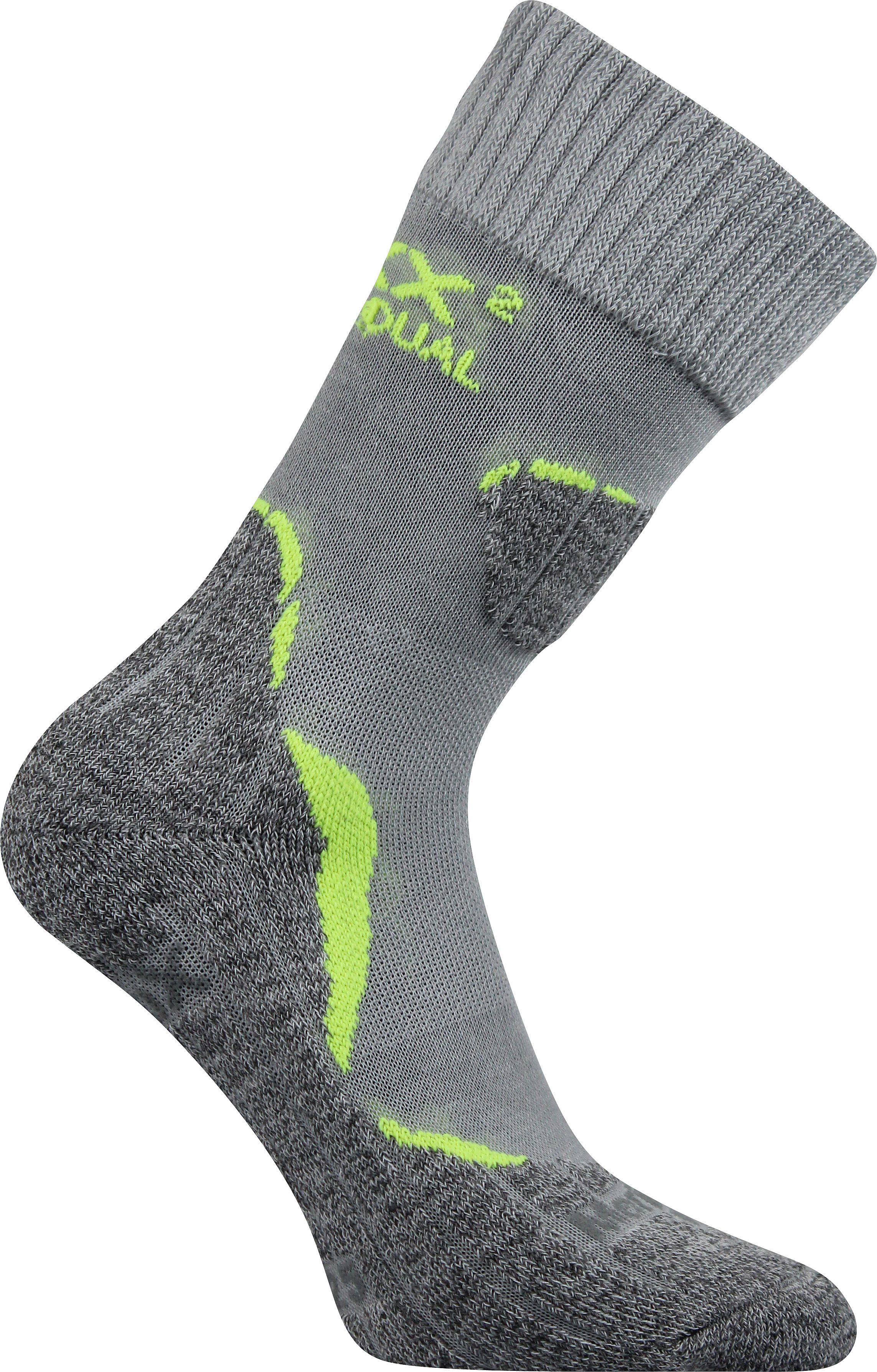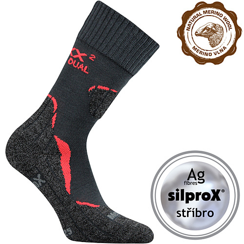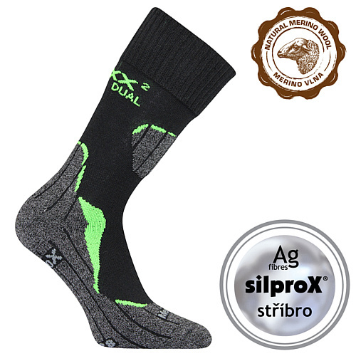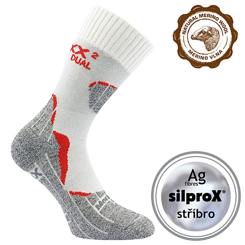 Dvouvrstvé termo ponožky VoXX® DUALIX 2 v 1 - to jsou dvojité speciální outdoorové ponožky pro muže i ženy. Jsou to dvě samostatné ponožky, které jsou speciálně zapletené a sešité do sebe. Tato ojedinělá kombinace vytváří pro nohy extra teplé a vysoce prodyšné prostředí. Zároveň mají zesílené froté zóny na ochranu proti otlakům a puchýřům. Samozřejmostí je volný nestahující lem, který nesvírá nohu a zaručuje jejich dobré prokrvení. Jsou vyráběné jen z nejkvalitnějších dostupných materiálů: merino vlna, silproX®, POLYCOLON® a Drytex a mají antibakteriální ochranu ionty stříbra. POLYCOLON® je moderní materiál, který odvádí pot od pokožky, udržuje teplo a tím zajišťuje svému nositeli maximální tepelný komfort. Ponožky VoXX mají teplotní třída D, která je řadí do extrémně mrazivého klima až do - 35°C.