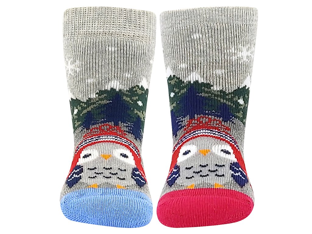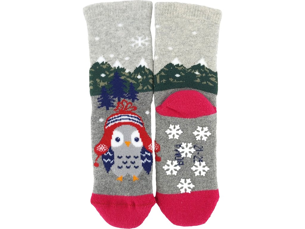 Kojenecké ponožky Boma® HUHIK ABS pro naše nejmenší zákazníky. Každá ponožka má obrázek roztomilé sovičky v zimní čepičce. Obrázkové ponožky mají jemný lem. Silnější ponožky jsou z bavlněného froté s podílem elastanu, takže jsou příjemné na pokožce ale zároveň jsou pružné a dobře si drží tvar. Aby ponožky netlačili, mají pro maximální pohodlí špičku spojenou jemným řetízkováním. Chodidlo mají opatřené protiskluzovými ABS body ve tvaru vloček.