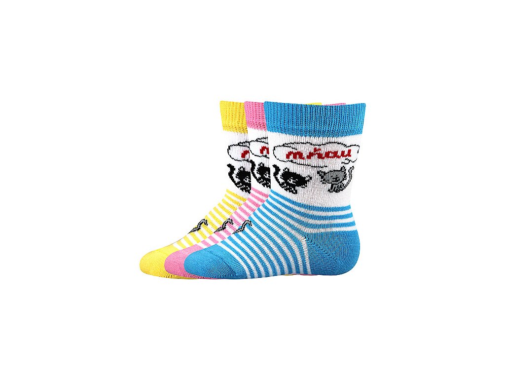 Kojenecké ponožky Boma® MIA jsou slabé ponožky pro nejmenší zákazníky. Barevné a veselé ponožky s obrázkem kočiček prodáváme ve výhodné sadě 3 párů. Tenké ponožky jsou bavlněné s podílem elastanu, takže jsou příjemné na pokožce ale zároveň jsou pružné a dobře si drží tvar.