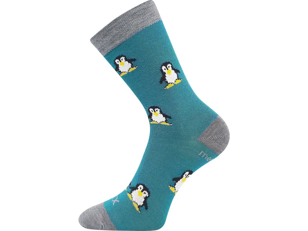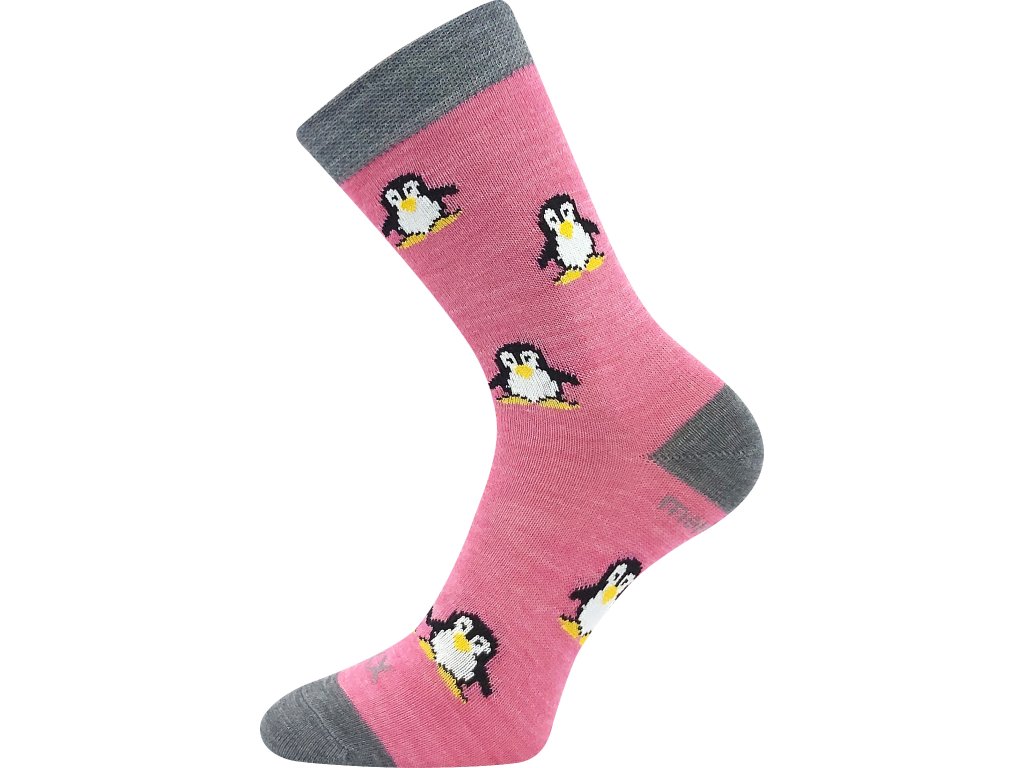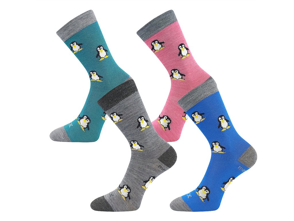 Dětské vlněné merino ponožky VoXX® PENGUINIK s obrázky roztomilých tučňáčků. Slabé ponožky jsou i tak teplé a hřejivé díky přírodnímu materiálu vlně merino. Další výhodou je antibakteriální vlastnosti díky materiálu silproX® s ionty stříbra. Jsou odolné proti opotřebení, mají vyztuženou špičku a patu. Studené nohy už vaše dítka mít rozhodně nebudou, ponožky mají teplotní třídu B vhodnou do teplot od -5°C do +20°C.