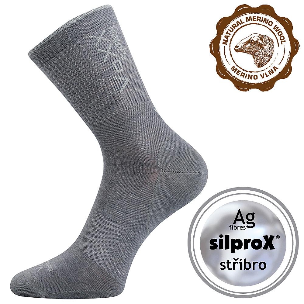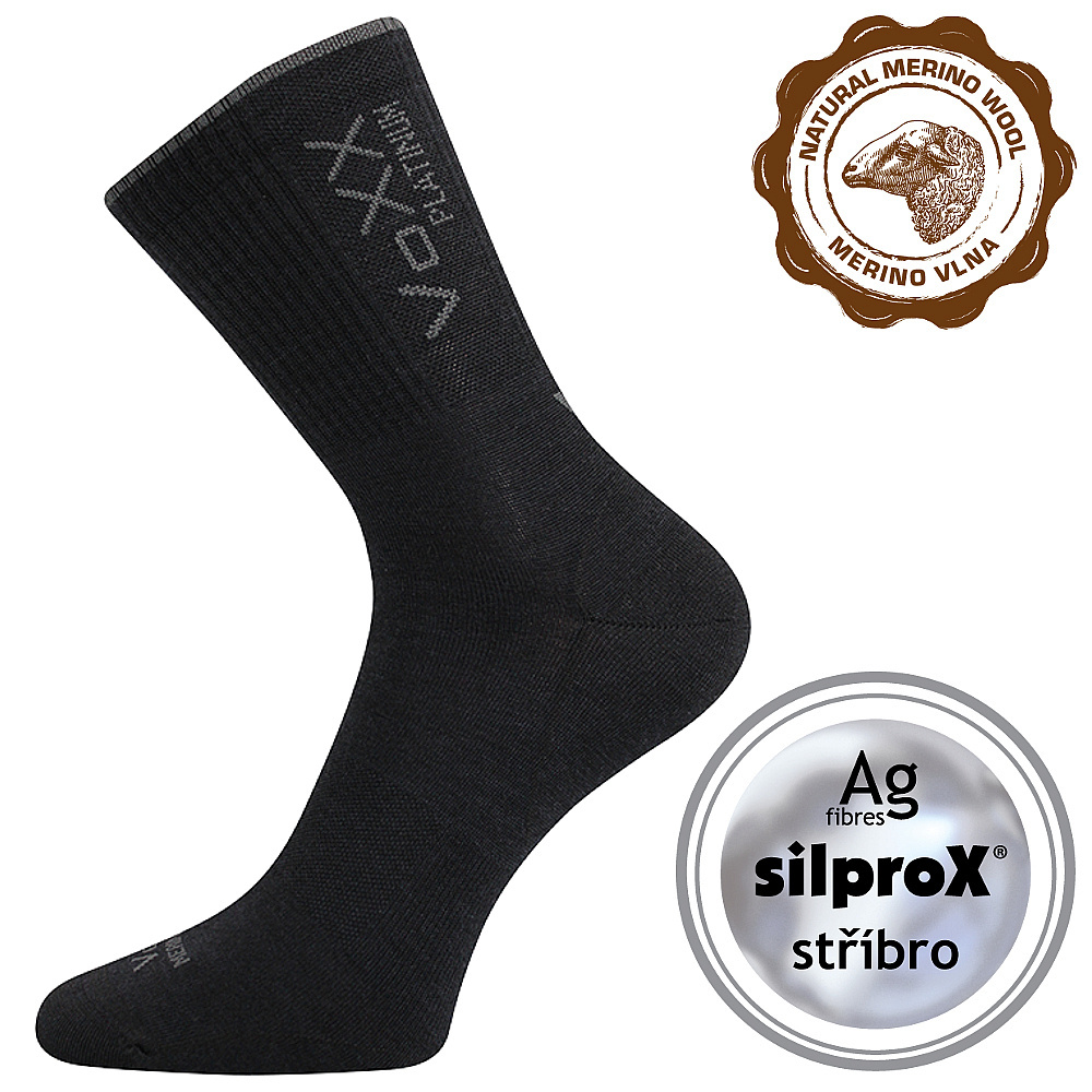 vlna merino - extra jemná ovčí vlna, jemný až hedvábný omak, termoregulační schopnosti, elastické, prodyšné, antibakteriální účinky, silprox® - speciálně vypředené polypropylenové vlákno s obsahem iontů stříbra, zabraňující vzniku zápachu a plísním