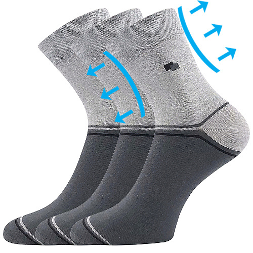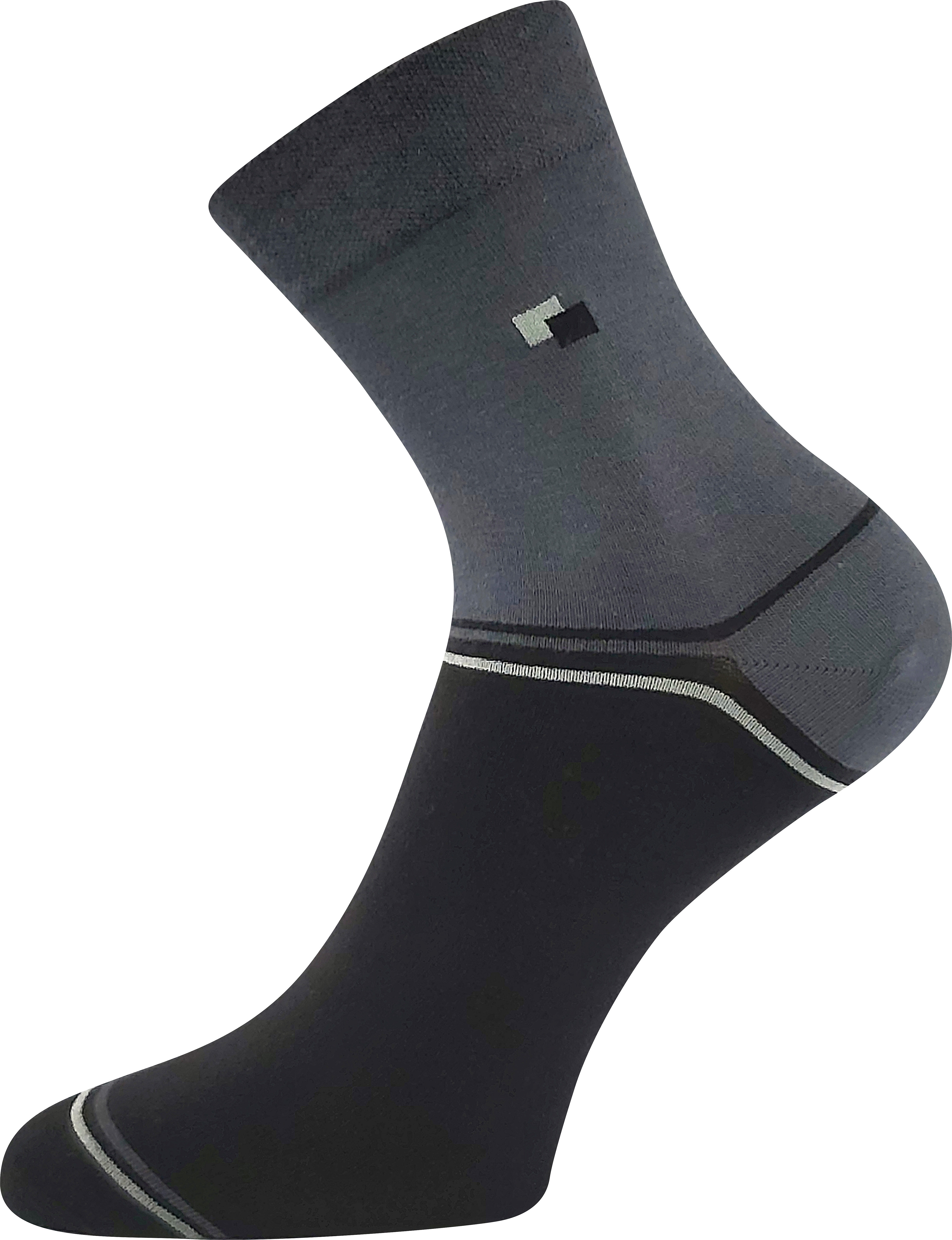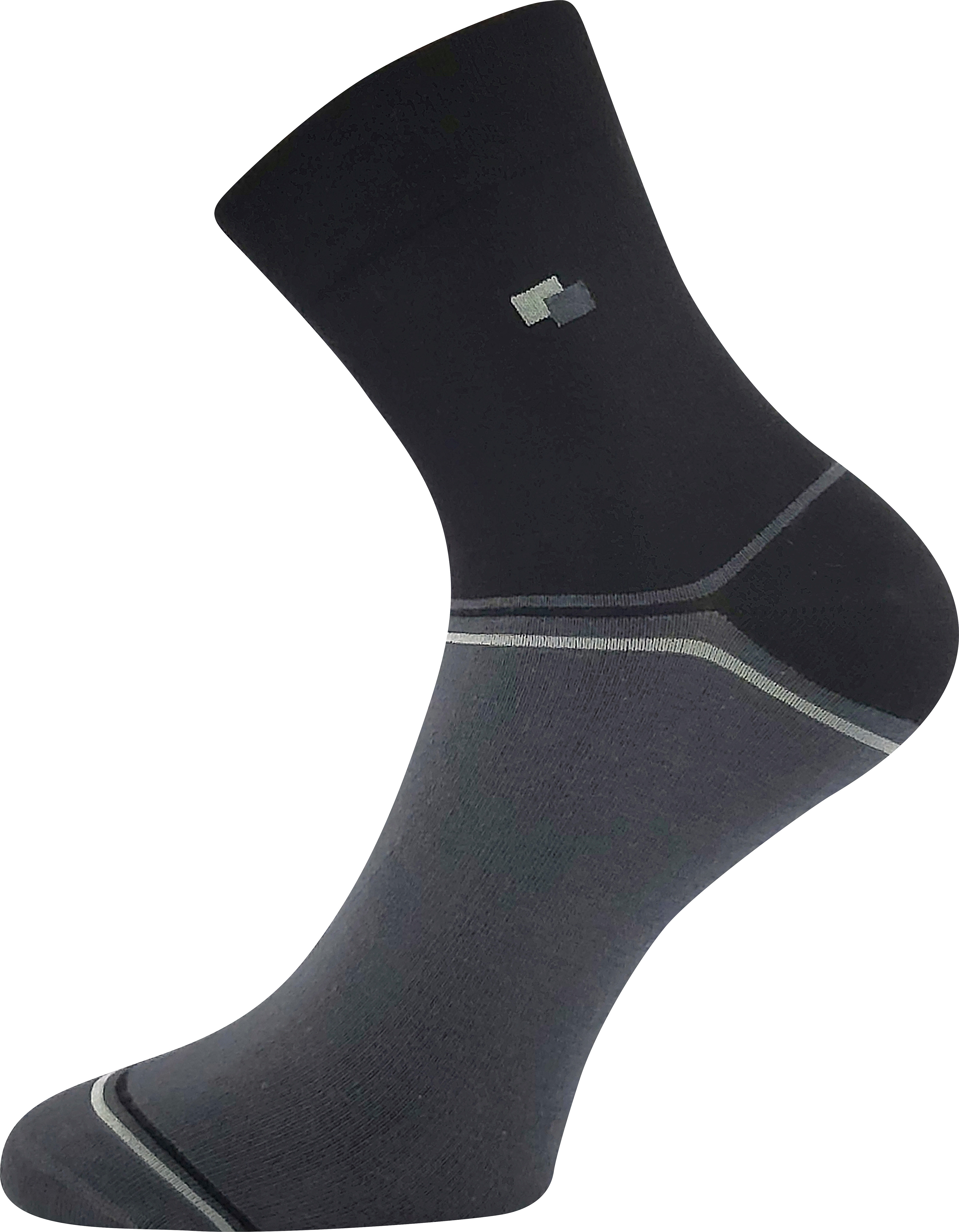 Pánské ponožky Lonka® ROGER 01 mají volný a nestahující pique lem, který nepříjemně neškrtí a můžou je nosit i muži se silnějšími nebo oteklými končetinami. Jednobarevné ponožky ve střední výšce užijete po celý den, jsou díky vysokému podílu bavlny velmi pohodlné. Slabé ponožky jsou velmi příjemné na dotyk a umí dobře pohlcovat vlhkost. Díky uzavření špice řetízkováním ponožky nikde netlačí a nevznikají tak otlaky ani puchýře. 200 jehlový úplet je velmi jemný a hladký, kvalitní ponožky mají navíc vypletený decentní vzorek.