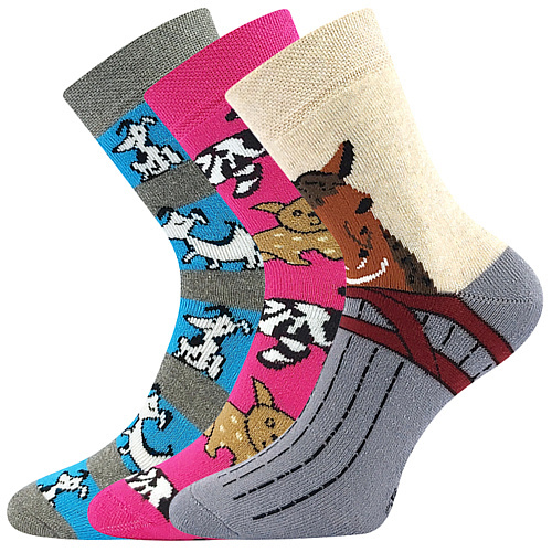 Dětské froté ponožky Boma® SIBIŘ 07 jsou hřejivé ponožky s vtipnými obrázky pro kluky i holky. Velmi jemné a teplé ponožky jsou příjemné na nošení. Zesílené froté chodidlo tlumí nárazy a nohy tak máte jako v bavlnce. Díky pružnému elastanu dobře drží tvar a nepadají dolů. Bavlněné ponožky jsou hebké na omak dokáží dobře pojmout vlhkost. Ve výhodném balení 3 párů v barvách pro dívky i pro chlapce.