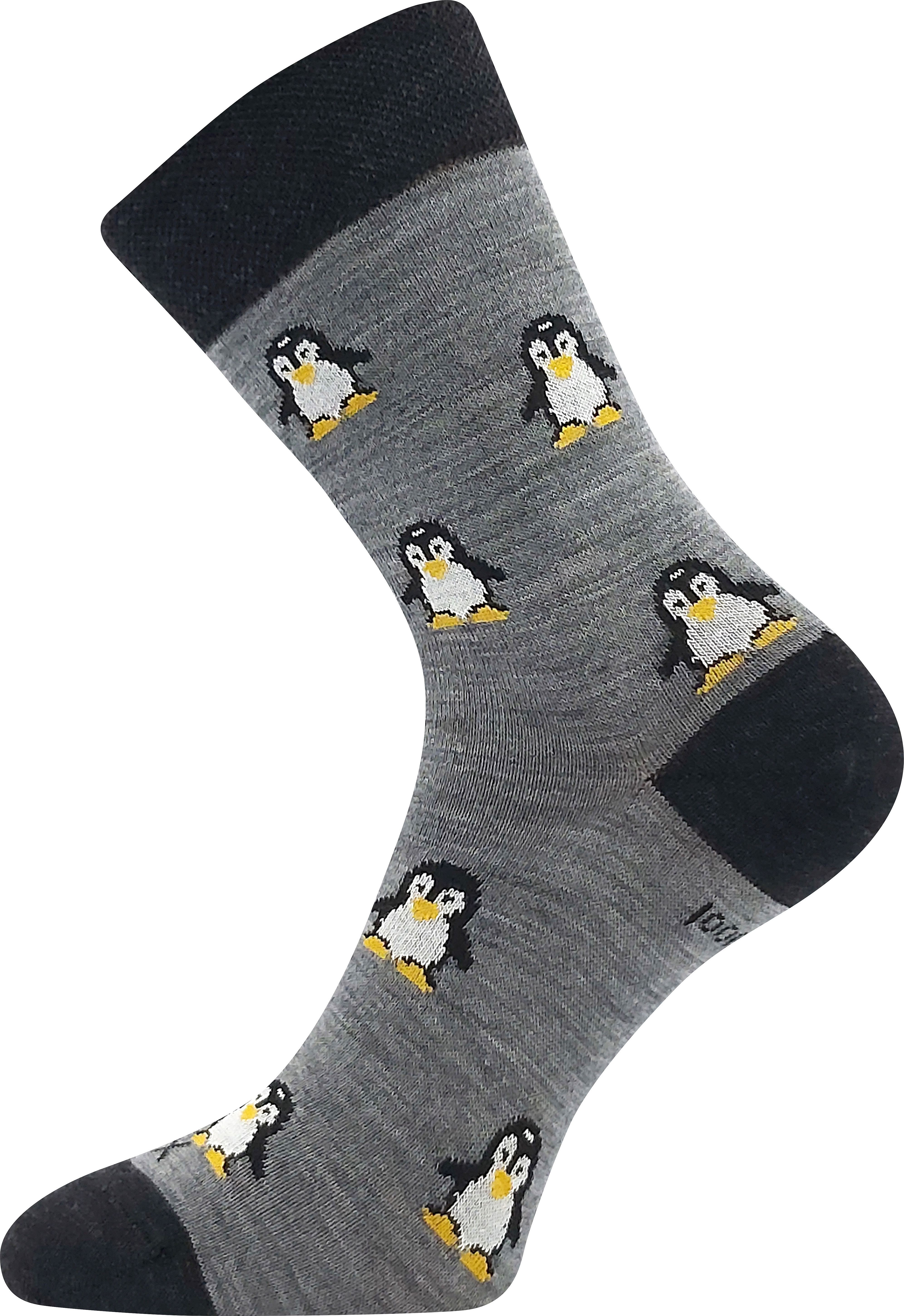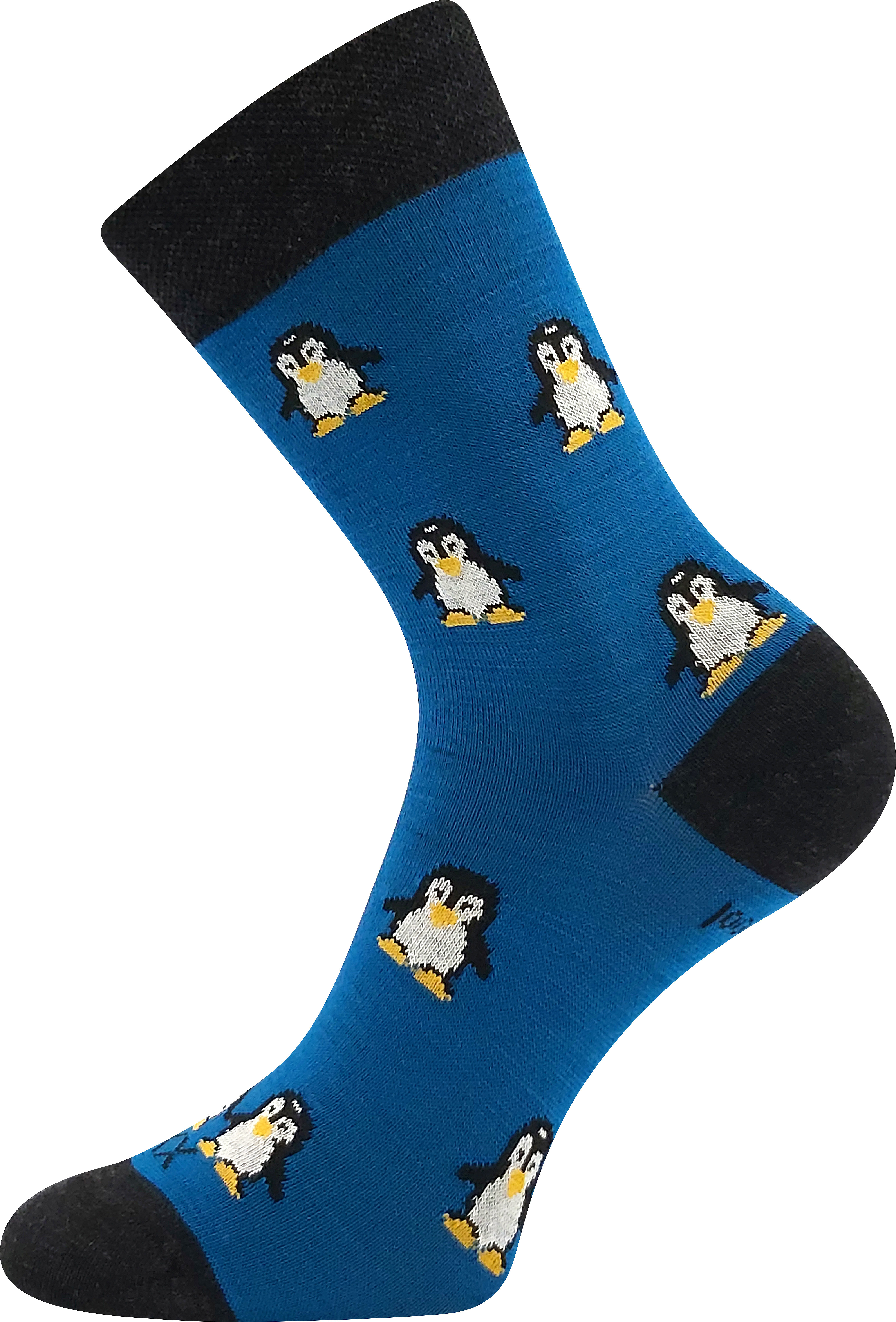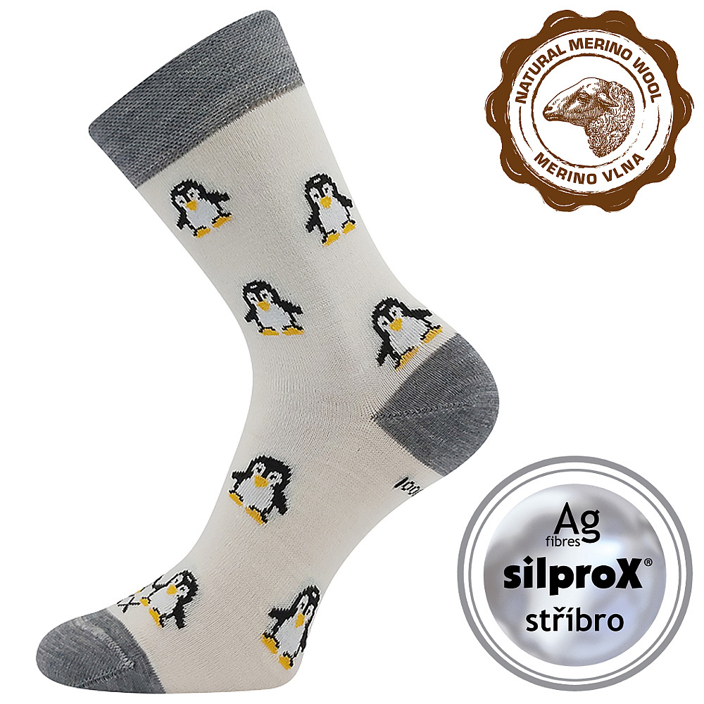 Dámské vlněné merino ponožky VoXX® SNĚŽENKA s vtipnými obrázky tučňáků jsou roztomilé na první pohled. Zároveň jsou odolné proti opotřebení, mají vyztuženou špičku a patu. Teplé slabé ponožky mají špici uzavřenou řetízkováním, takže nikde netlačí. Materiály merino vlna a silproX® s ionty stříbra jsou přirozeně antibakteriální, omezují tvorbu bakterií a plísní – ty jsou v ponožkách přirozeně zničeny a nedochází pak k tvorbě zápachu. Ve vlněných ponožkách už studené nohy rozhodně mít nebudete, ponožky mají teplotní třídy B-C.
