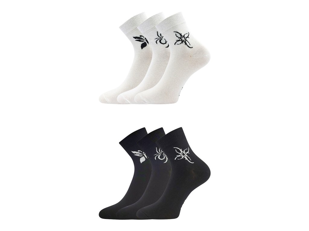 Dámské ponožky Boma® TATOO jsou hladké ponožky ve střední výšce nad kotník. Slabé ponožky mají vysoký podíl bavlny, jsou tak velmi příjemné na omak a výborně sají pot. Elastan dobře drží tvar ponožek. Jemný lem nikde neškrtí a nezamezuje oběhu krve. Půvabné ponožky jsou vhodné na celodenní nošení. Jednobarevné ponožky zdobí motiv tetování, na výběr jsou 3 varianty ve výhodném balení.