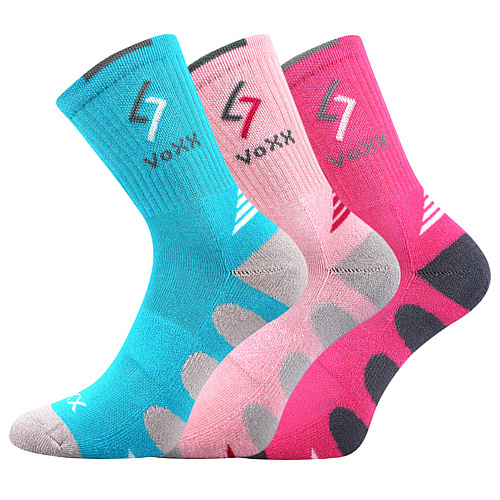 Dětské sportovní ponožky VoXX® TRONIC jsou froté sportovní ponožky určené na běh, treking, tenis nebo halové sporty. Vyšší elastický lem a zóna přes nárt drží ponožky na svém místě. Zesílené polstrované froté chodidlo tlumí nárazy a napomáhá větší výdrži při extrémní námaze a zátěži při každodenním použití. Přírodní bavlna je příjemná na omak a dobře pohlcuje vlhkost. Ponožky v teplotní třídě B jsou vhodné do rozmezí teplot od -5°C do +20°C. Dostupné i ve výhodném balení 3 párů v mixu barev pro dívky i chlapce.