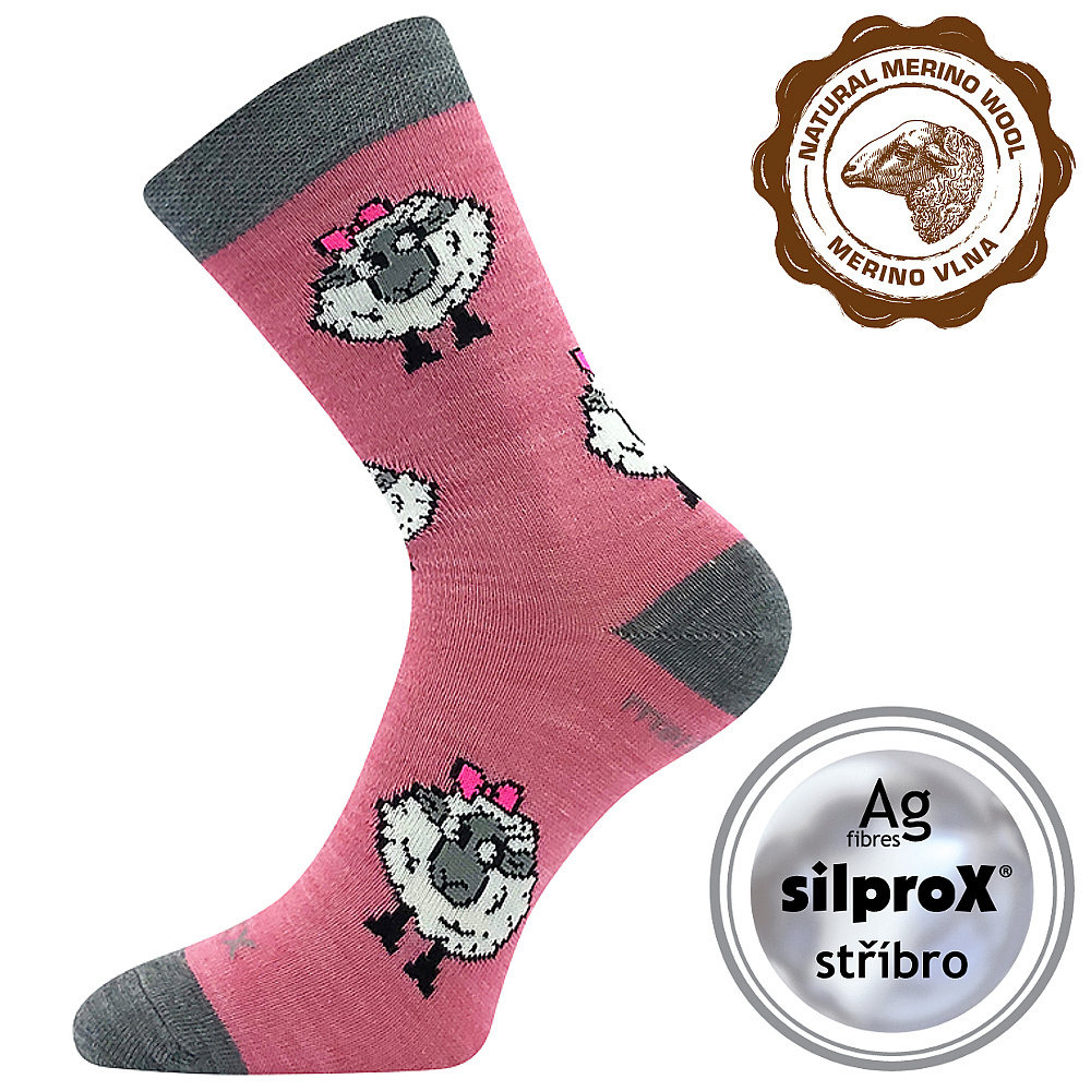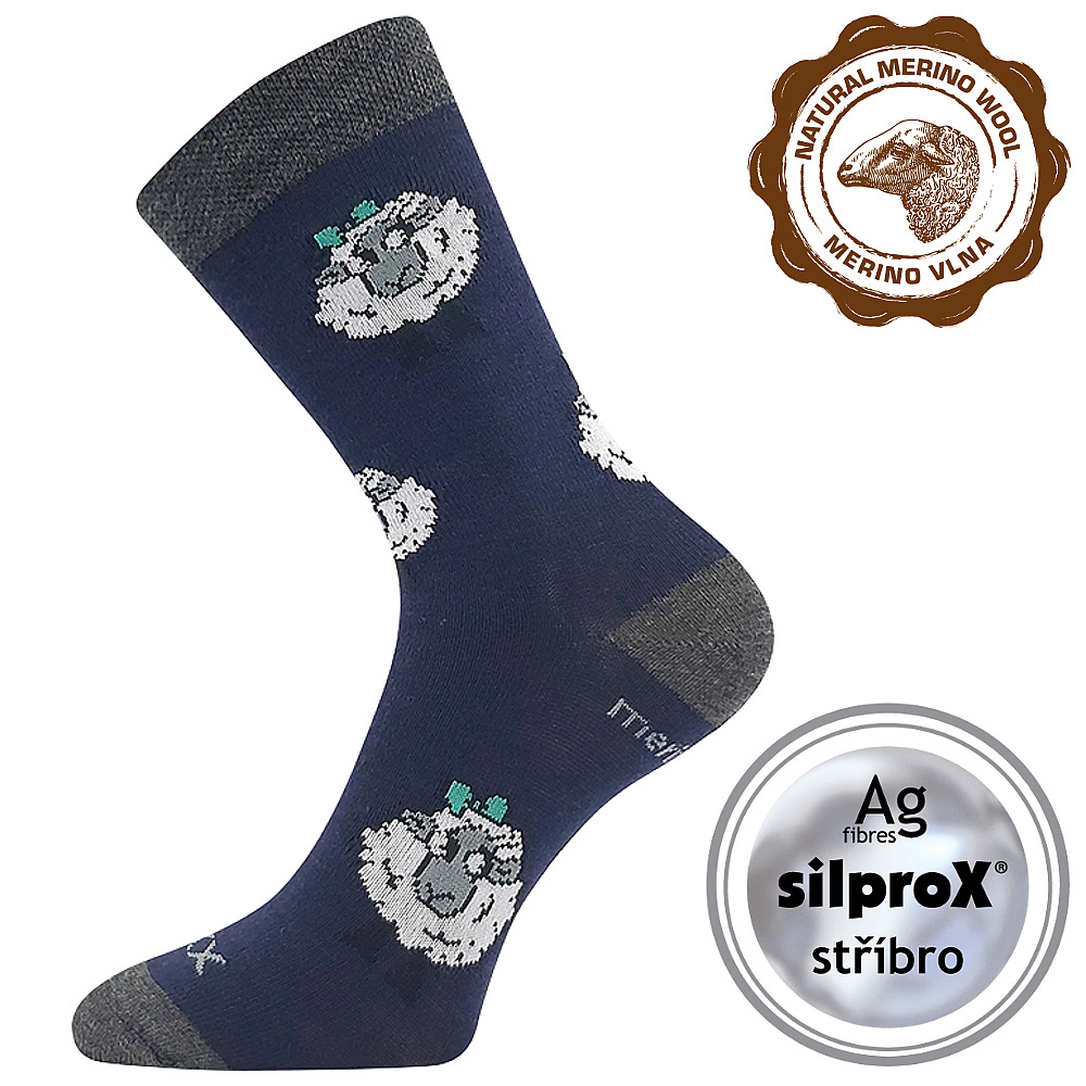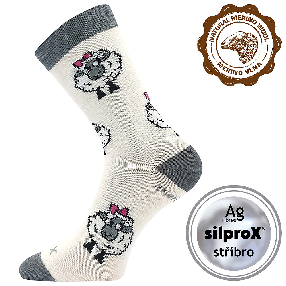 Dětské slabé vlněné merino ponožky VoXX® VLNĚNKA s roztomilými obrázky oveček vtipně odkazují na materiál, ze kterého jsou upletené. Jsou odolné proti opotřebení, mají vyztuženou špičku a patu. Teplé a zároveň slabé ponožky jsou i tak hřejivé z merino vlny, doplněné o antibakteriální silproX® s ionty stříbra. Studené nohy už vaše dítka mít rozhodně nebudou, ponožky mají teplotní třídu B vhodnou do teplot od -5°C do +20°C.