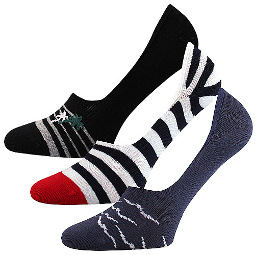 Dámské a pánské ťapky VoXX® VORTY jsou extra nízké ponožky, které jsou neviditelné v obuvi. Díky silikonovým proužkům uvnitř umístěných na patě, ponožky dobře drží na noze a neklouzají dolů. Elastická zóna přes nárt zabraňuje přetáčení ponožek. Řetízkovaná špice spojená plochým švem nezpůsobuje otlaky ani puchýře. Díky vysokému podílu bavlny jsou příjemné na omak i k pokožce, dobře pohlcují vlhkost. Neviditelné slabé ponožky jsou v teplotní třídě A, od +10°C do +35°C a dostupné jsou ve výhodném balení po 3 párech v mixu sladěných designů.